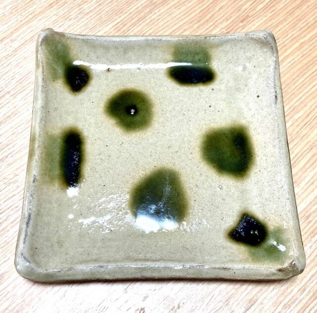 【日本】沖縄 読谷山焼(やちむん) 北窯 松田共司 点打三彩 4.5寸 角皿
