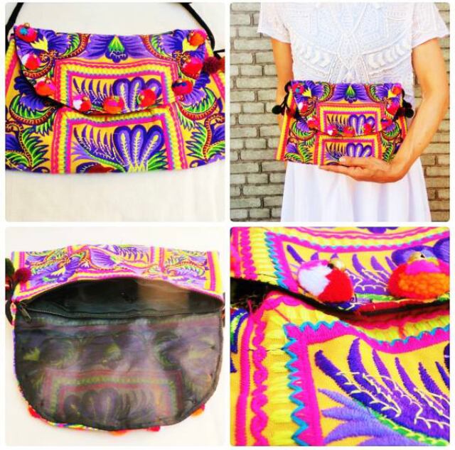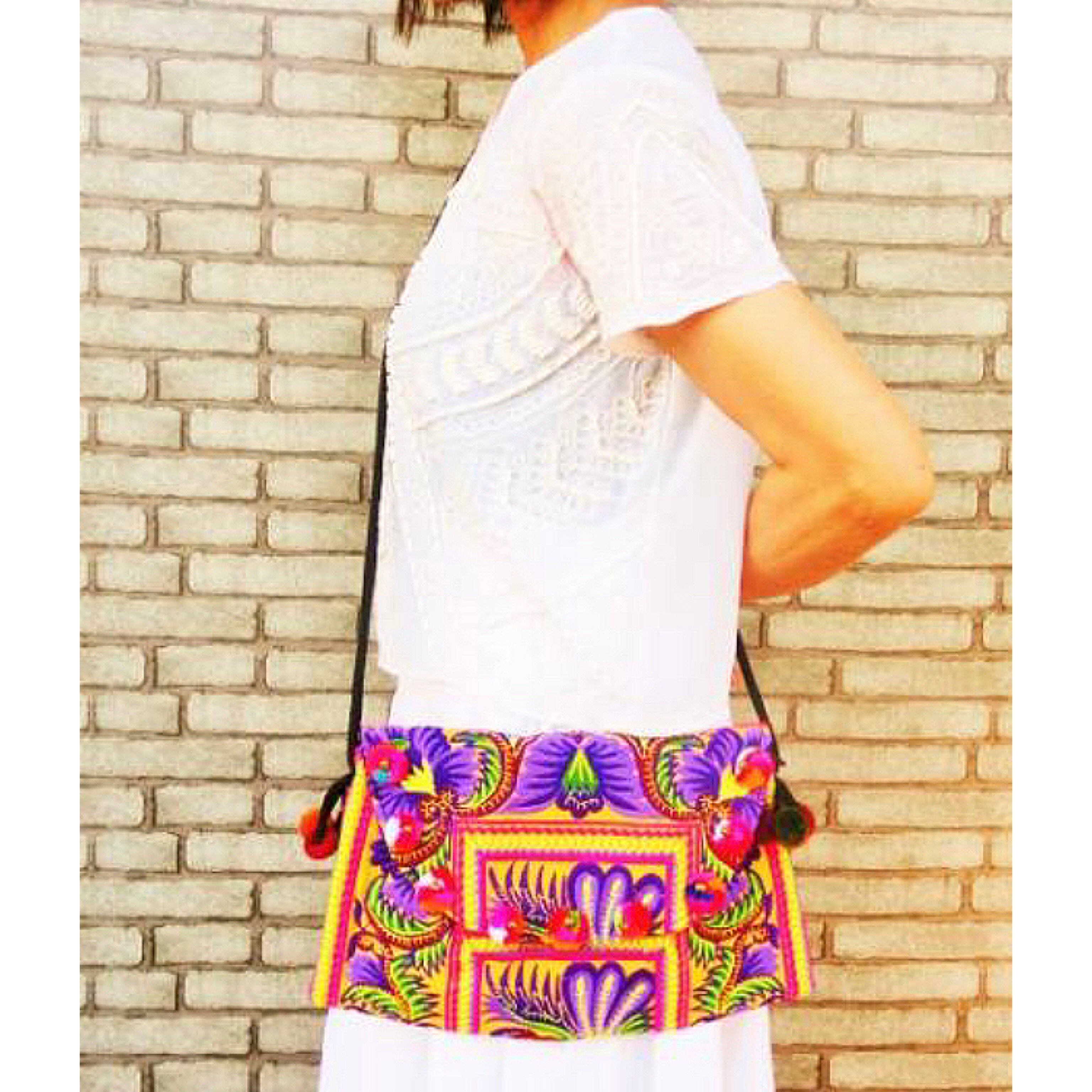 【タイ】モン族 刺繍&ポンポン 2WAYバッグ (クラッチバッグ ショルダーバッグ)