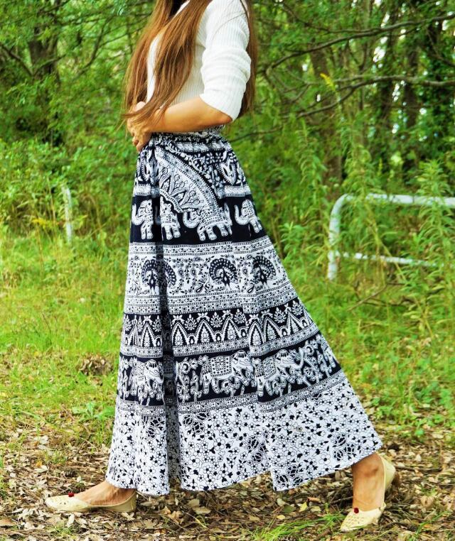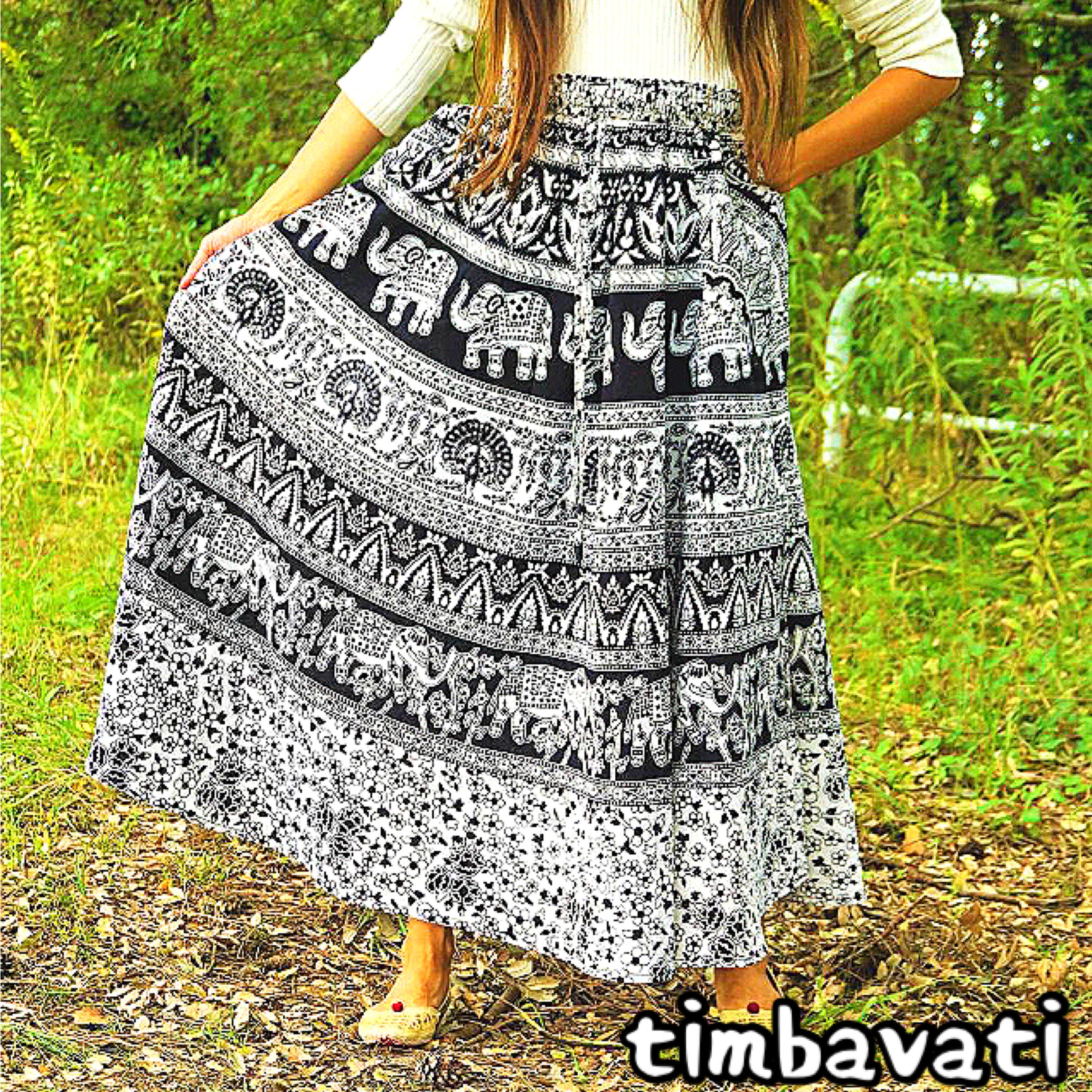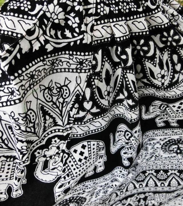 【ネパール】アジアン柄 ロングスカート フリーサイズ (モノクロ) ポケット×2