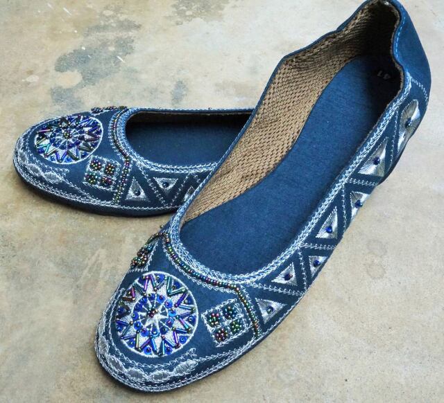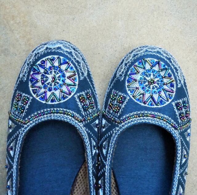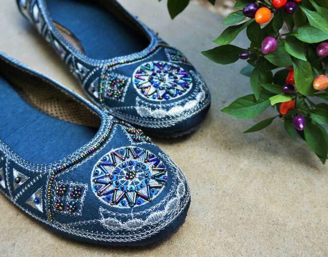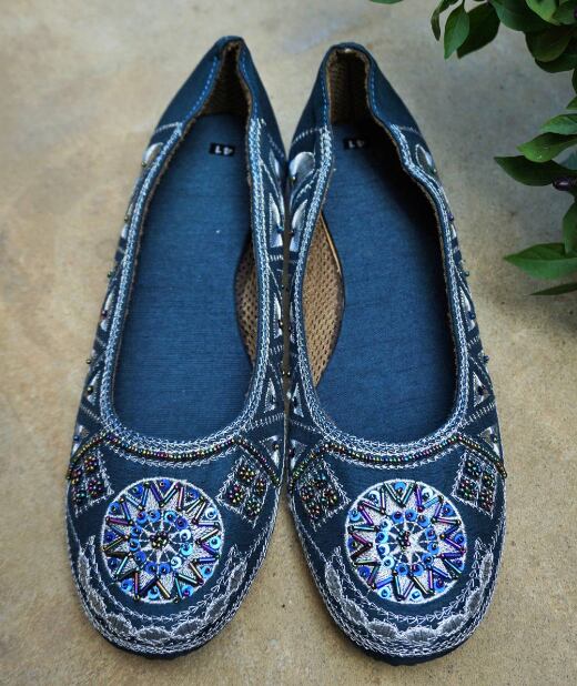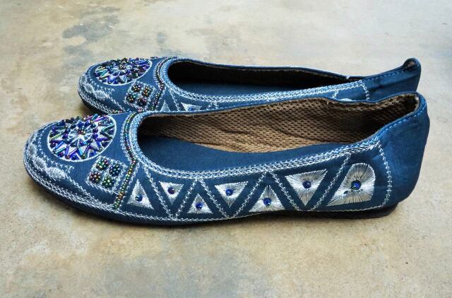 【ベトナム】アジアン ビーズ&刺繍 フラットシューズ *ネイビーグリーン系*