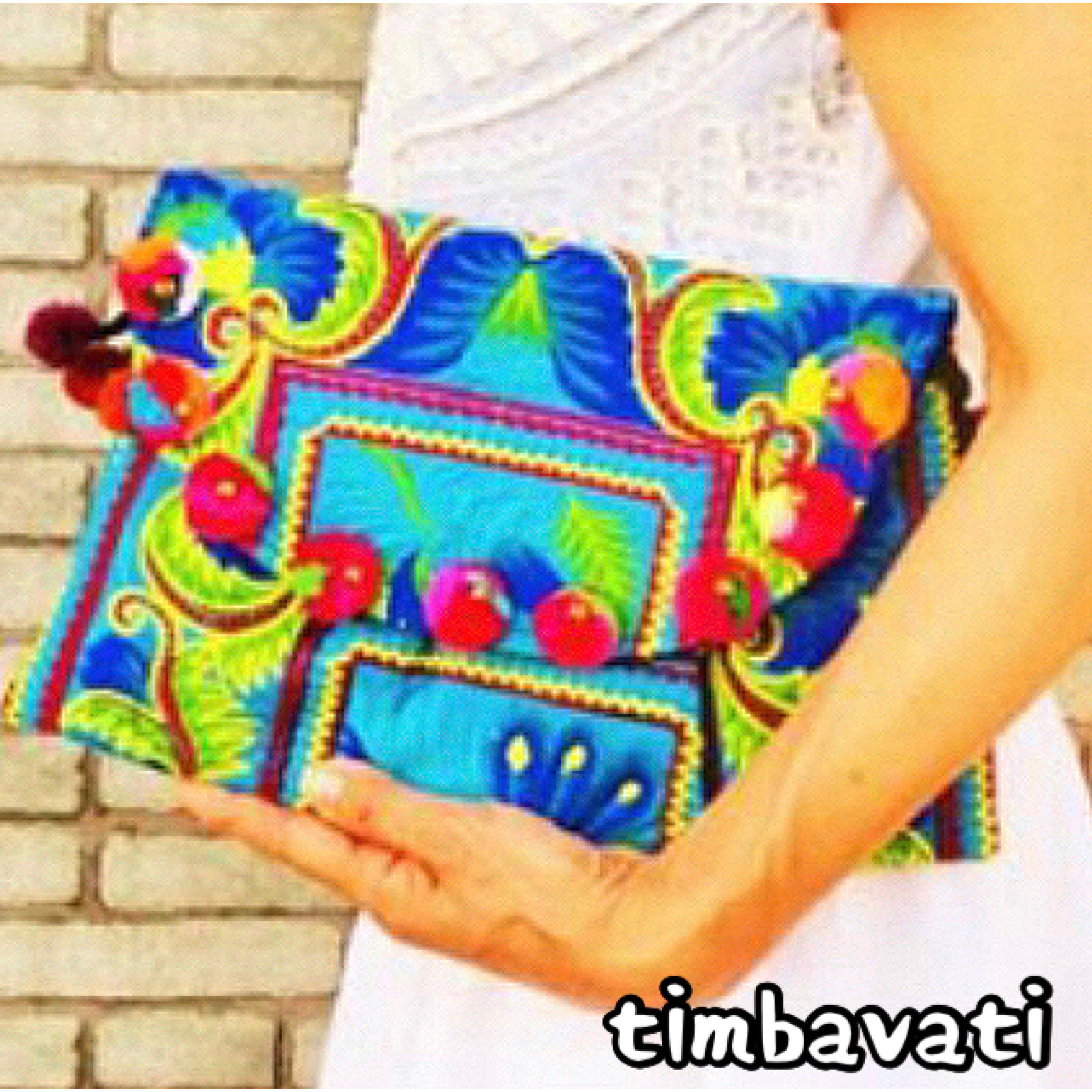 【タイ】モン族 刺繍&ポンポン 2WAYバッグ (クラッチバッグ ショルダーバッグ)