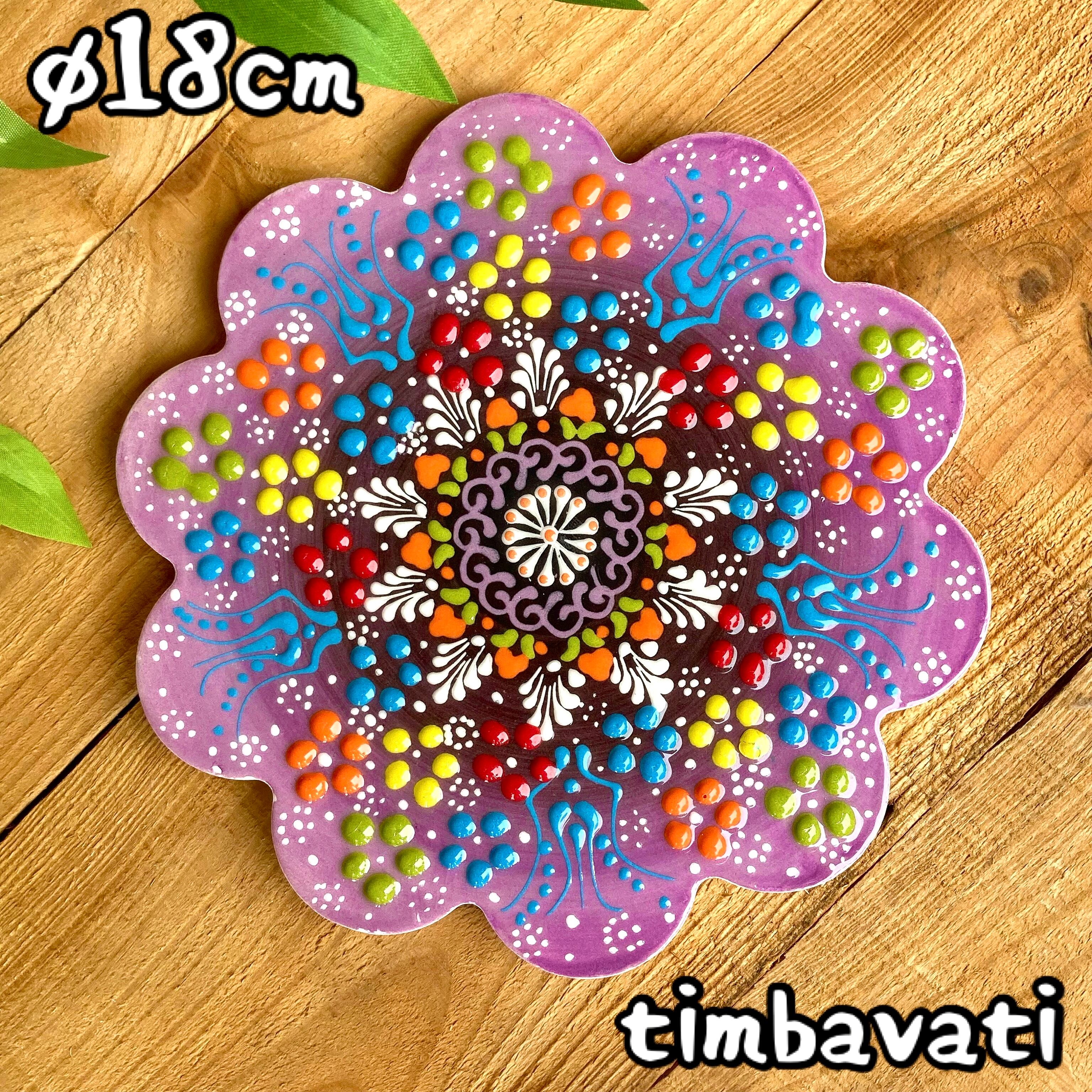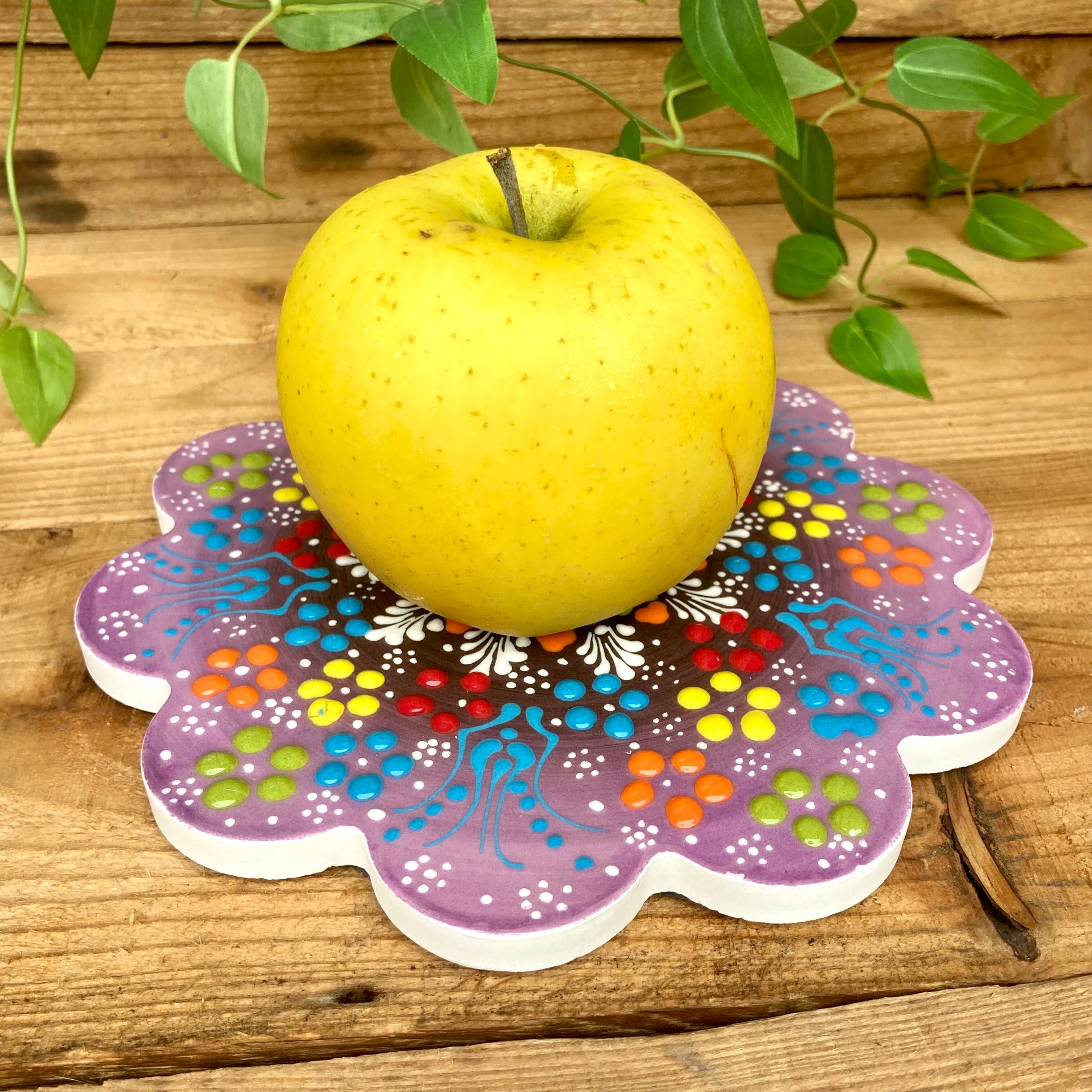 18cm【トルコ陶器】手描き 鍋敷き 壁掛け タイル *パープル* キュタフヤ陶器