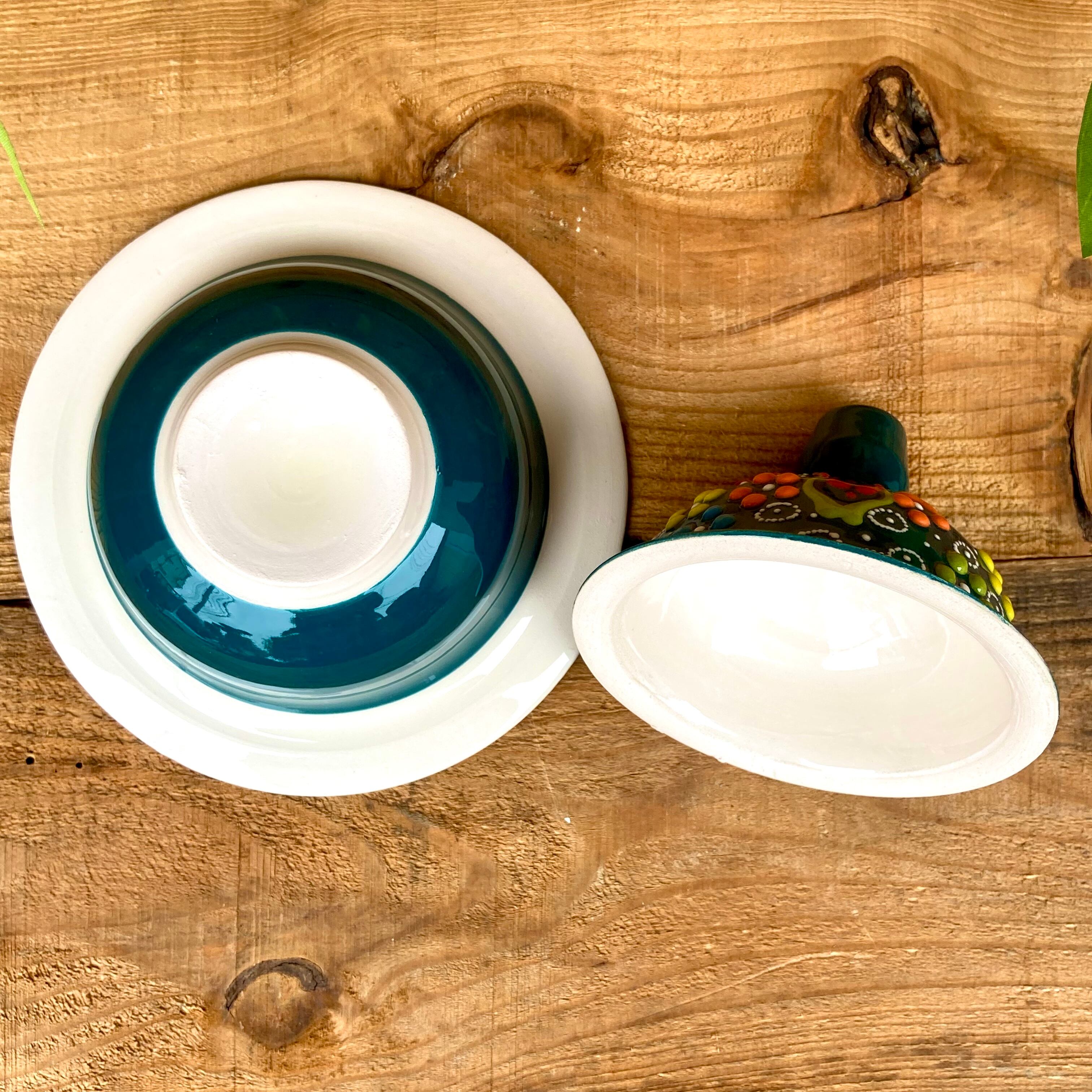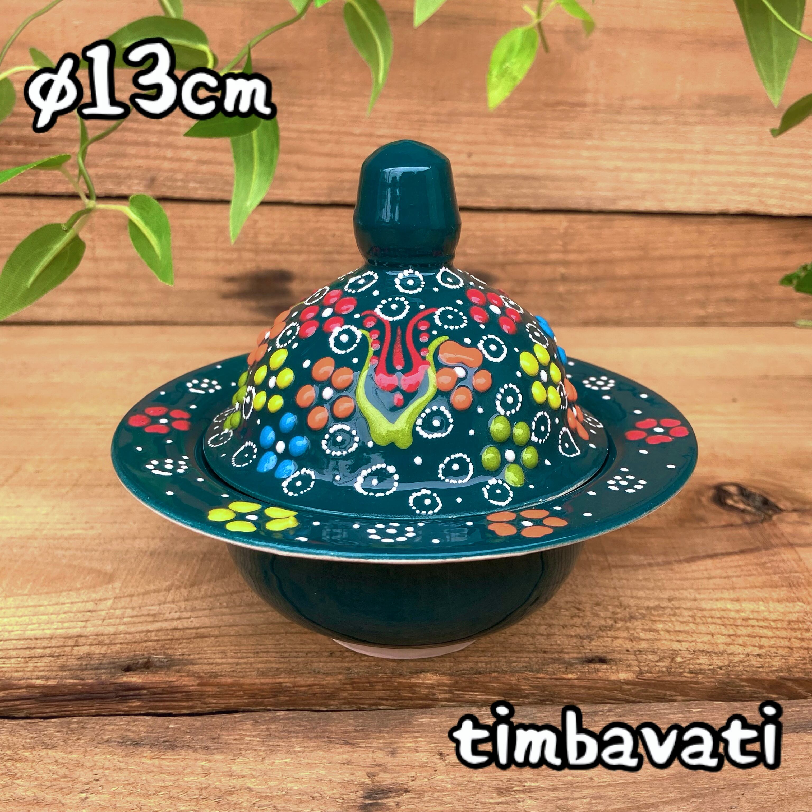 【トルコ陶器】手描き シュガーポット 小物入れ*ダークグリーン*キュタフヤ陶器