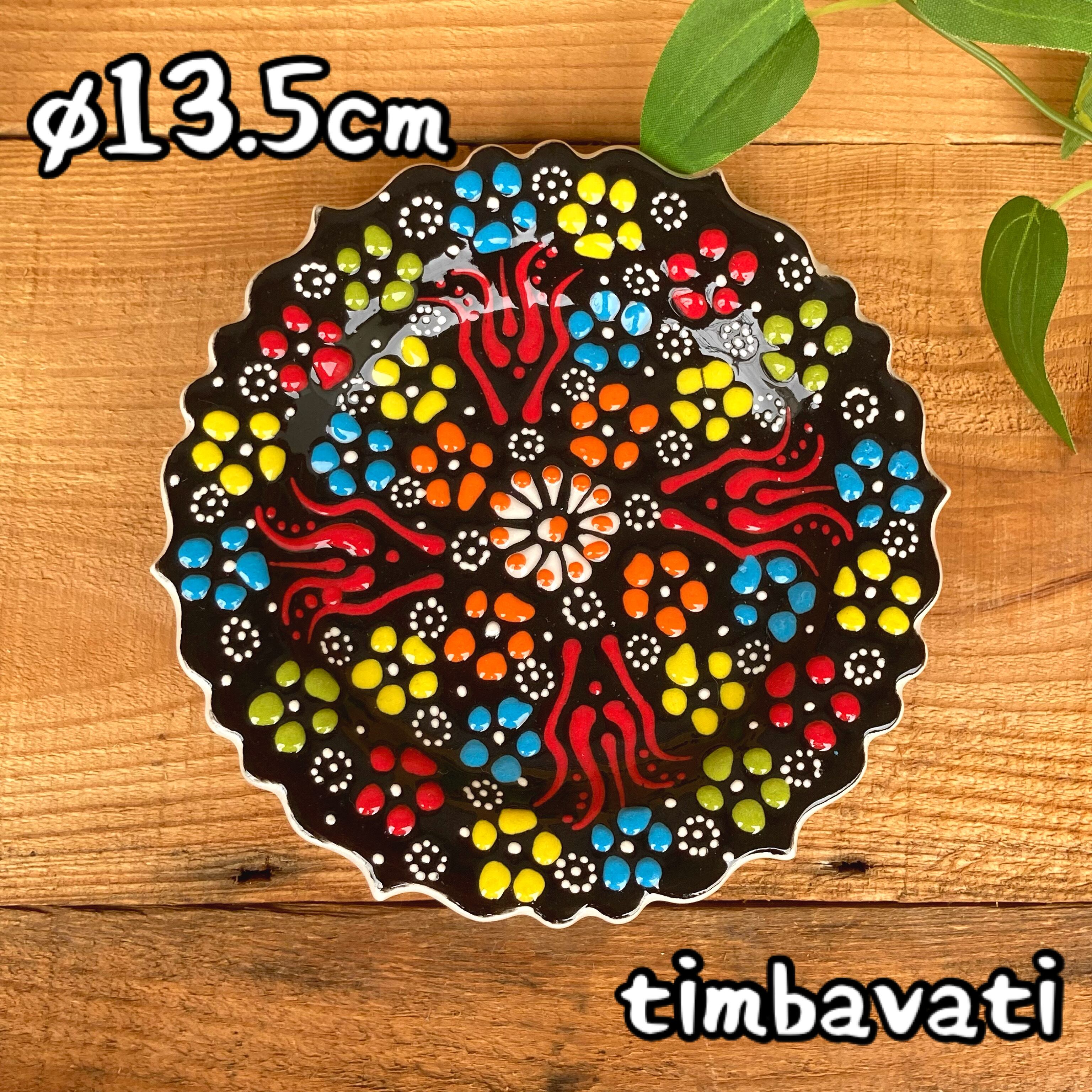 13.5cm【トルコ陶器】手描き 中皿 壁掛け *ブラック*キュタフヤ陶器