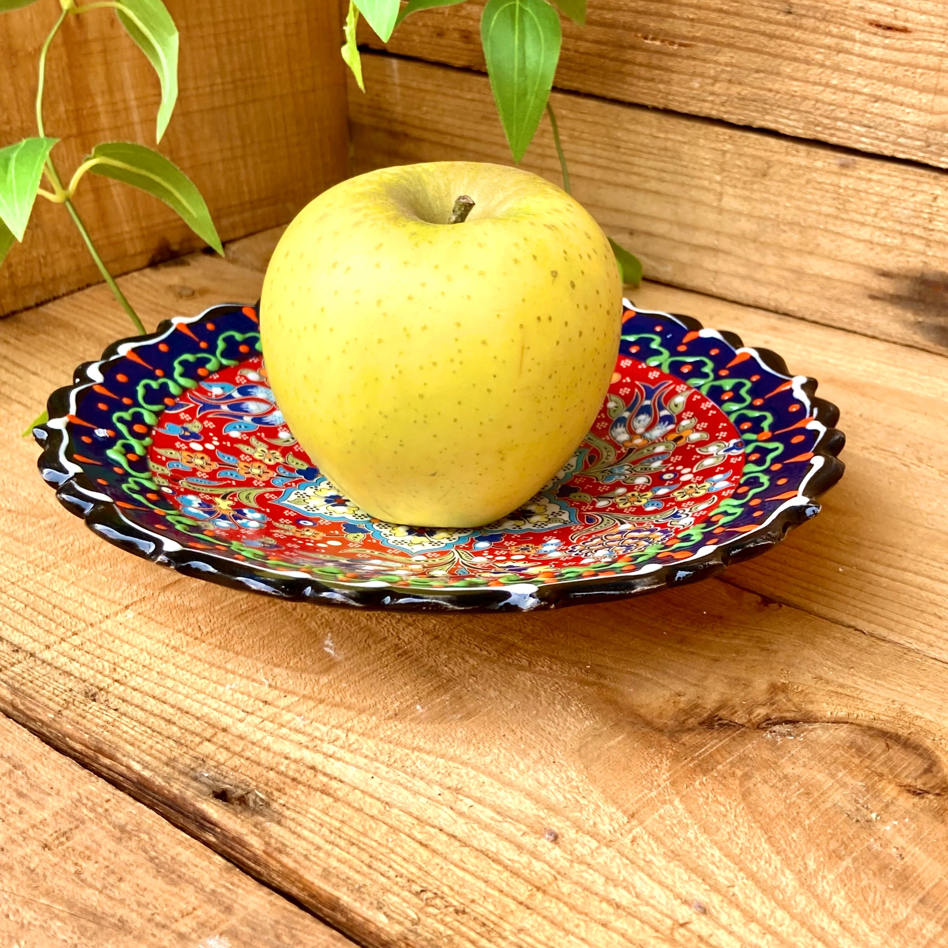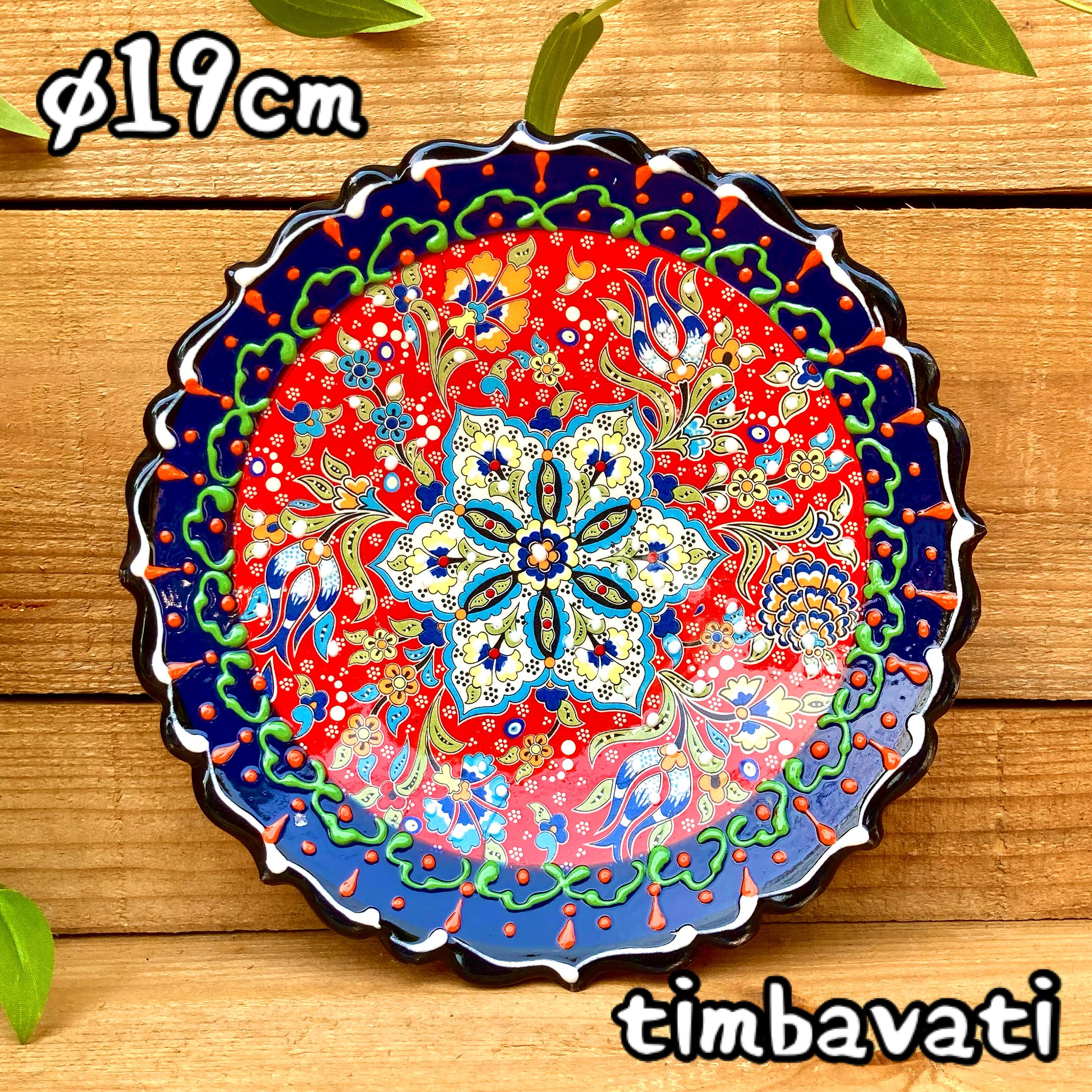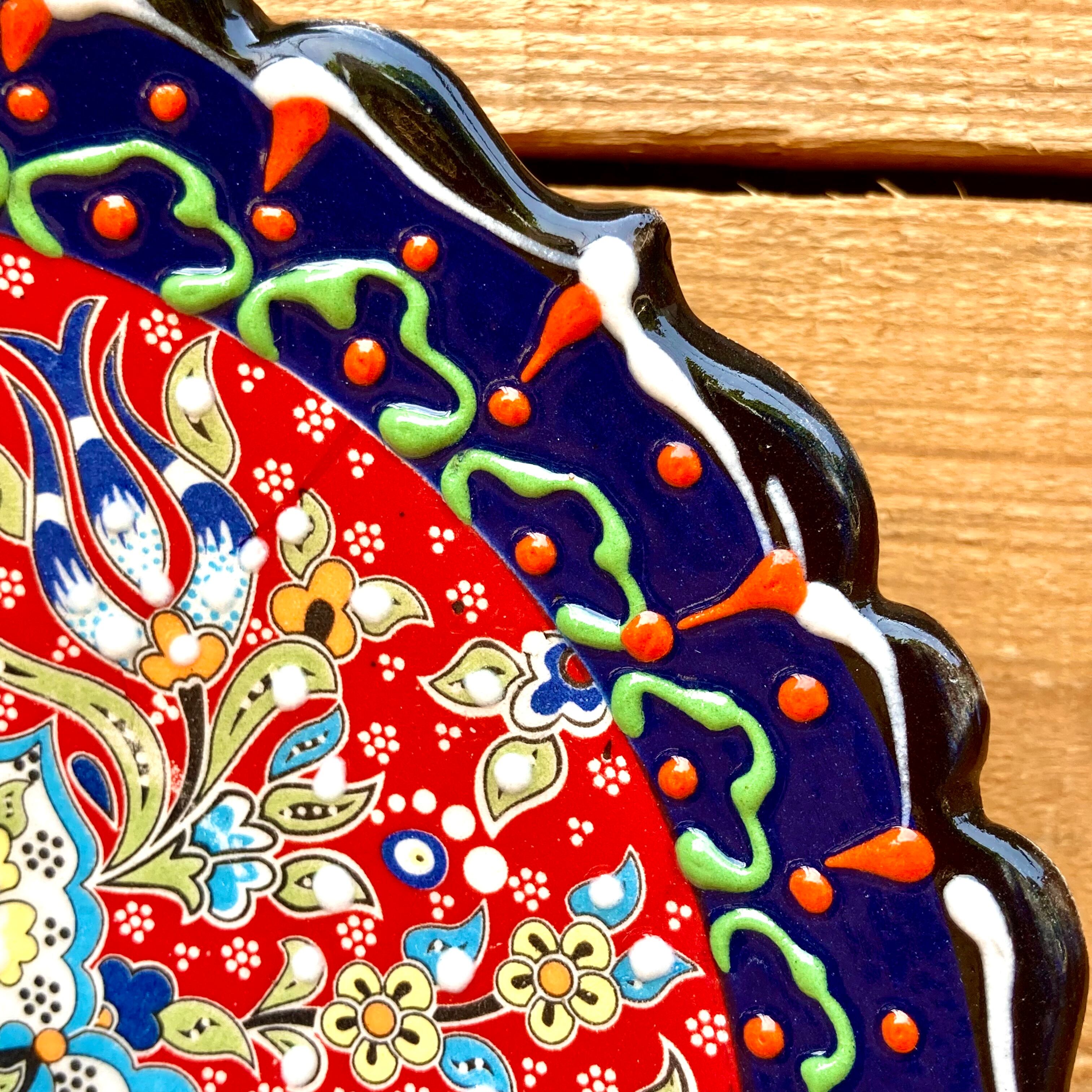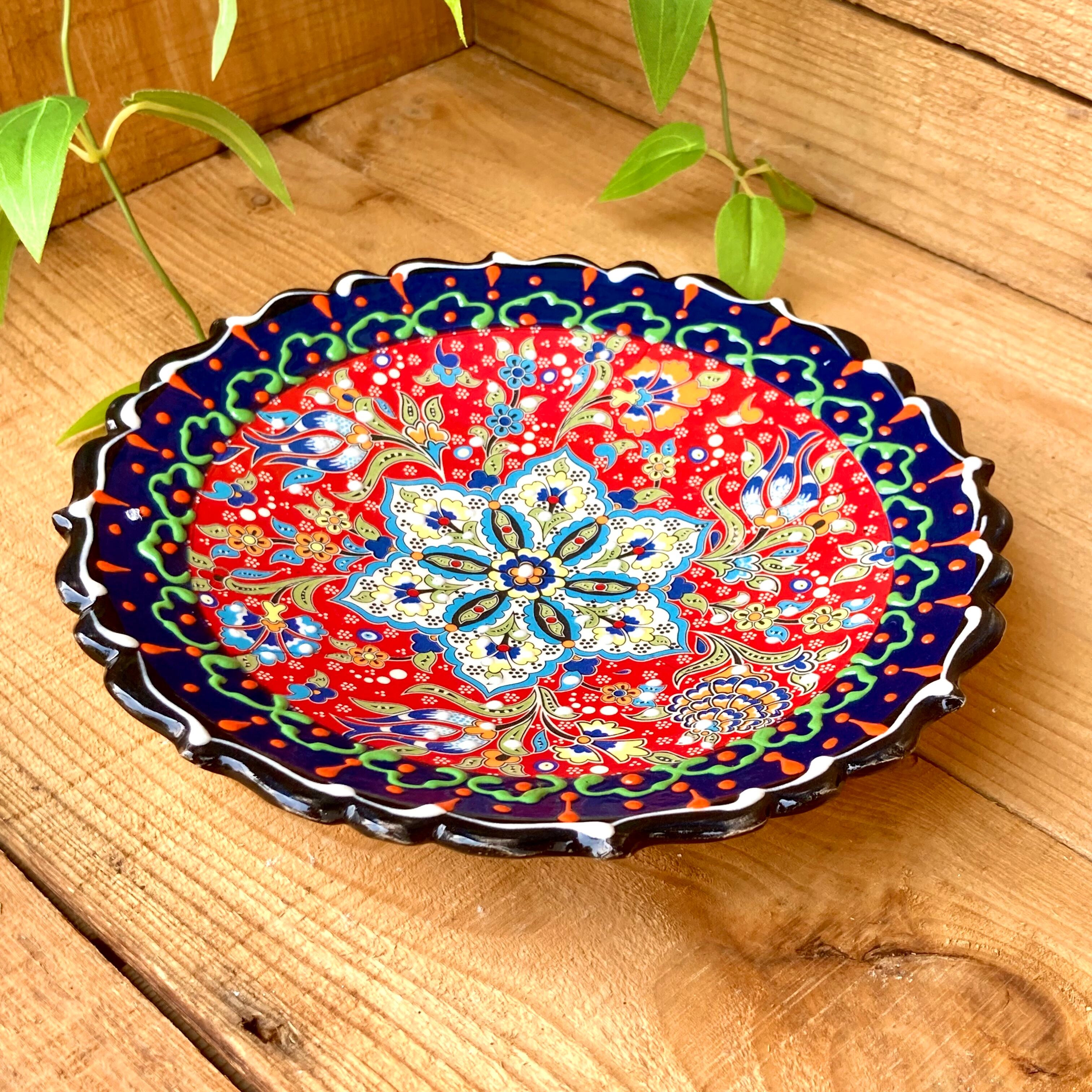 19cm【トルコ陶器】手描き 中皿 壁掛け *ネイビー レッド*キュタフヤ陶器