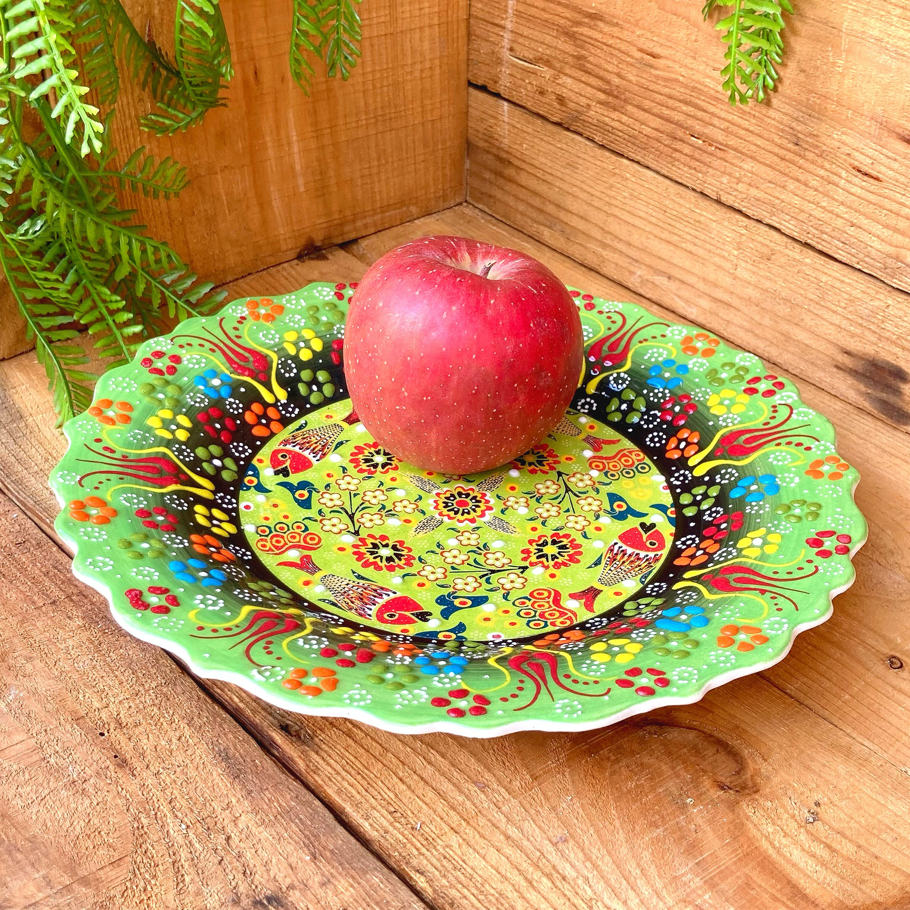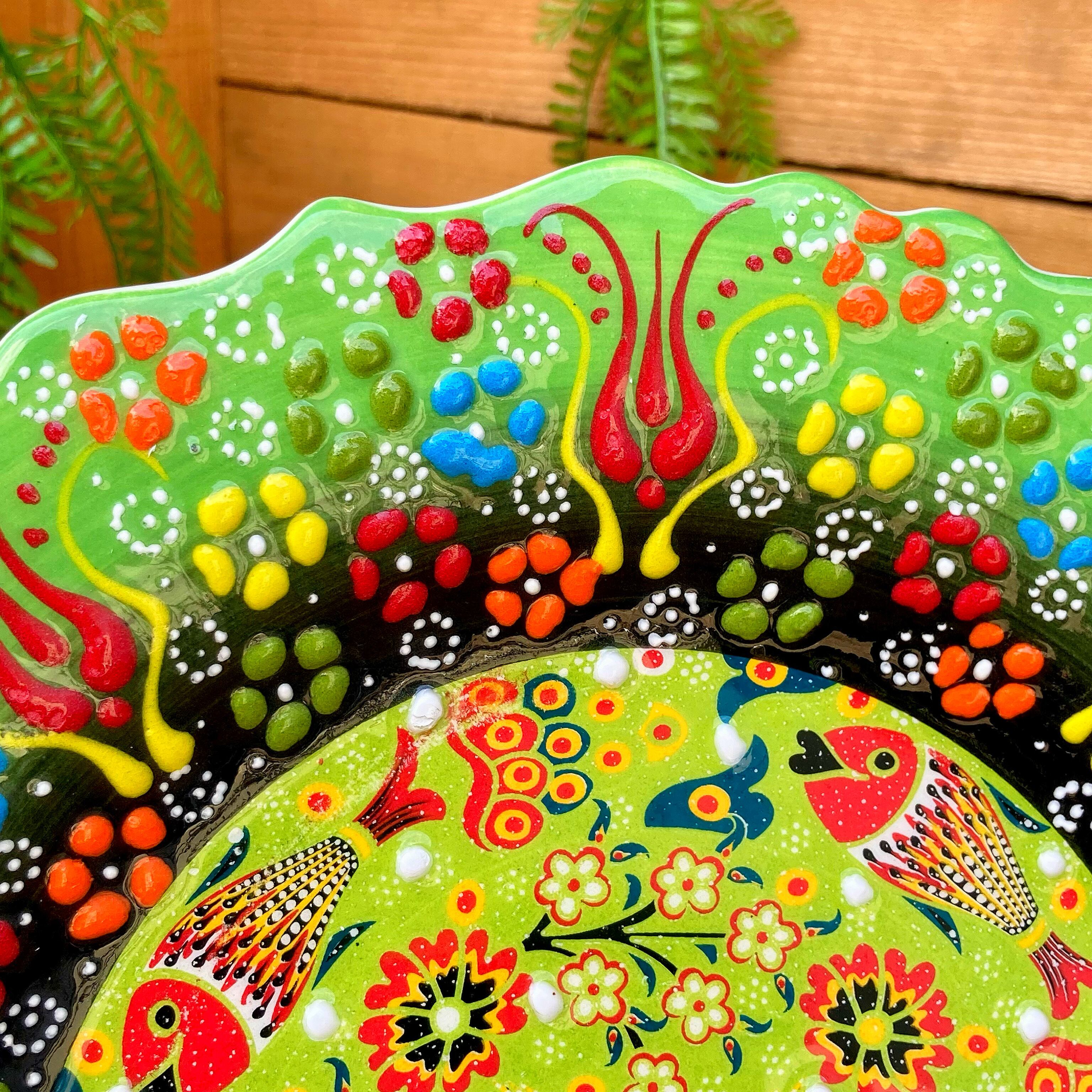 26.5cm【トルコ陶器】手描き 大皿 壁掛け *ライトグリーン魚*キュタフヤ陶器