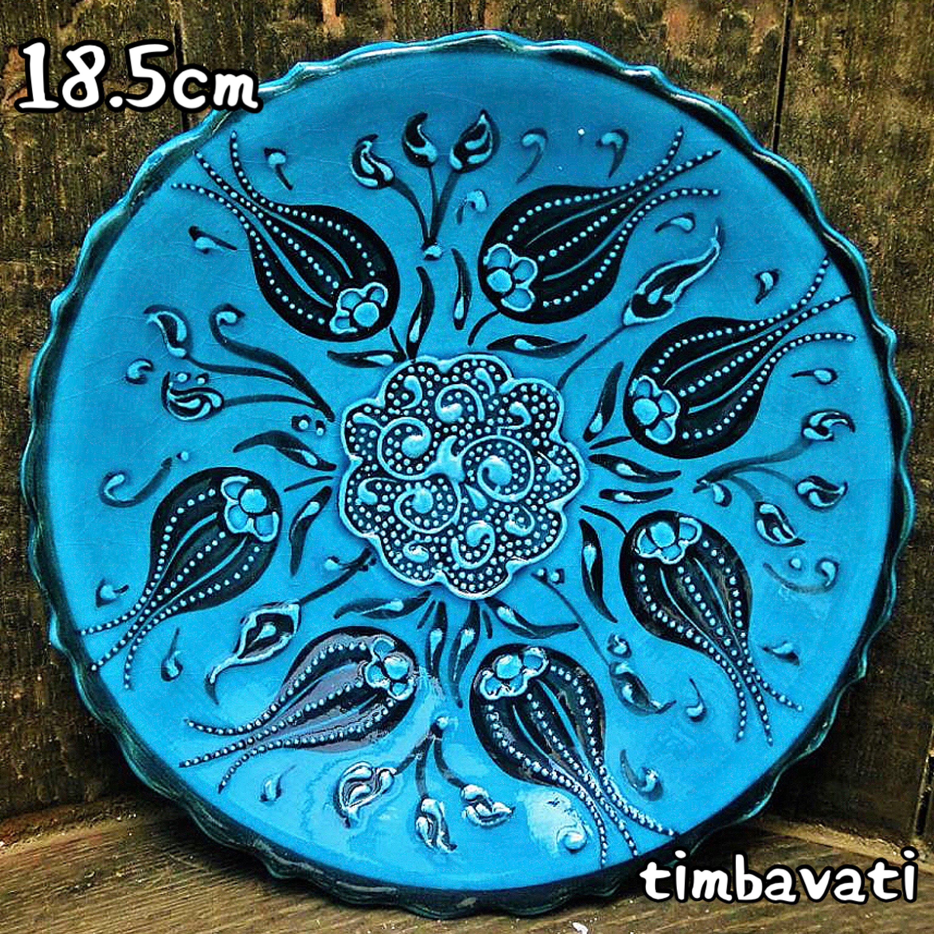 18.5cm【トルコ陶器】手描き 中皿 壁掛け *アダムブルー*キュタフヤ陶器