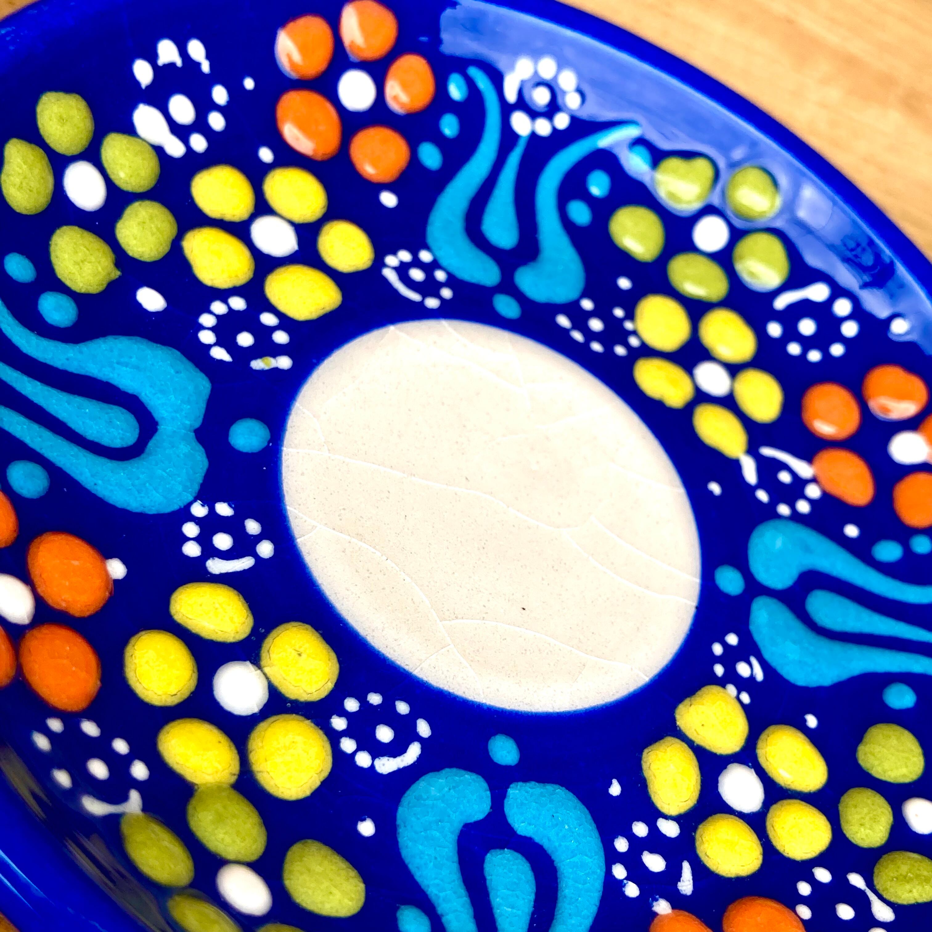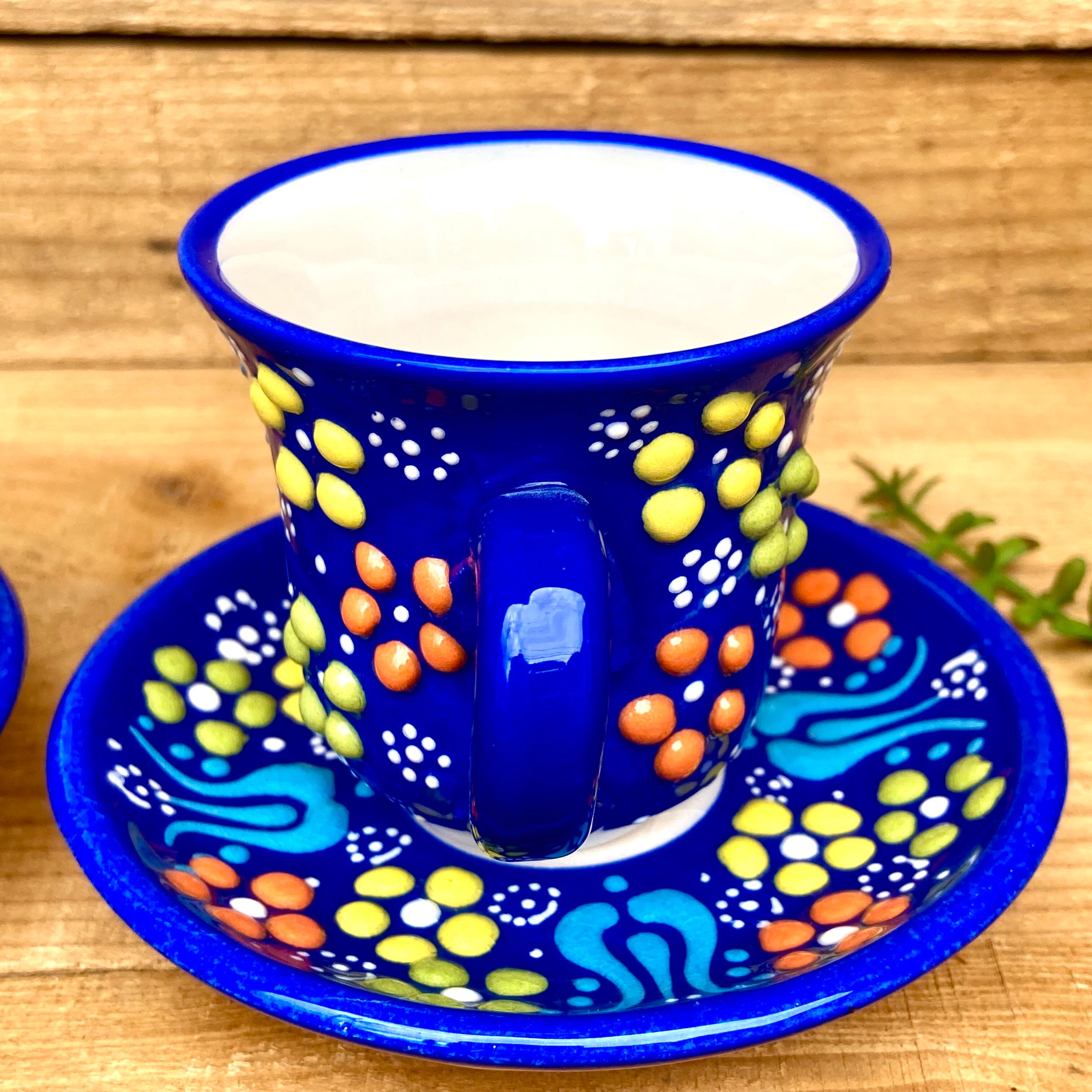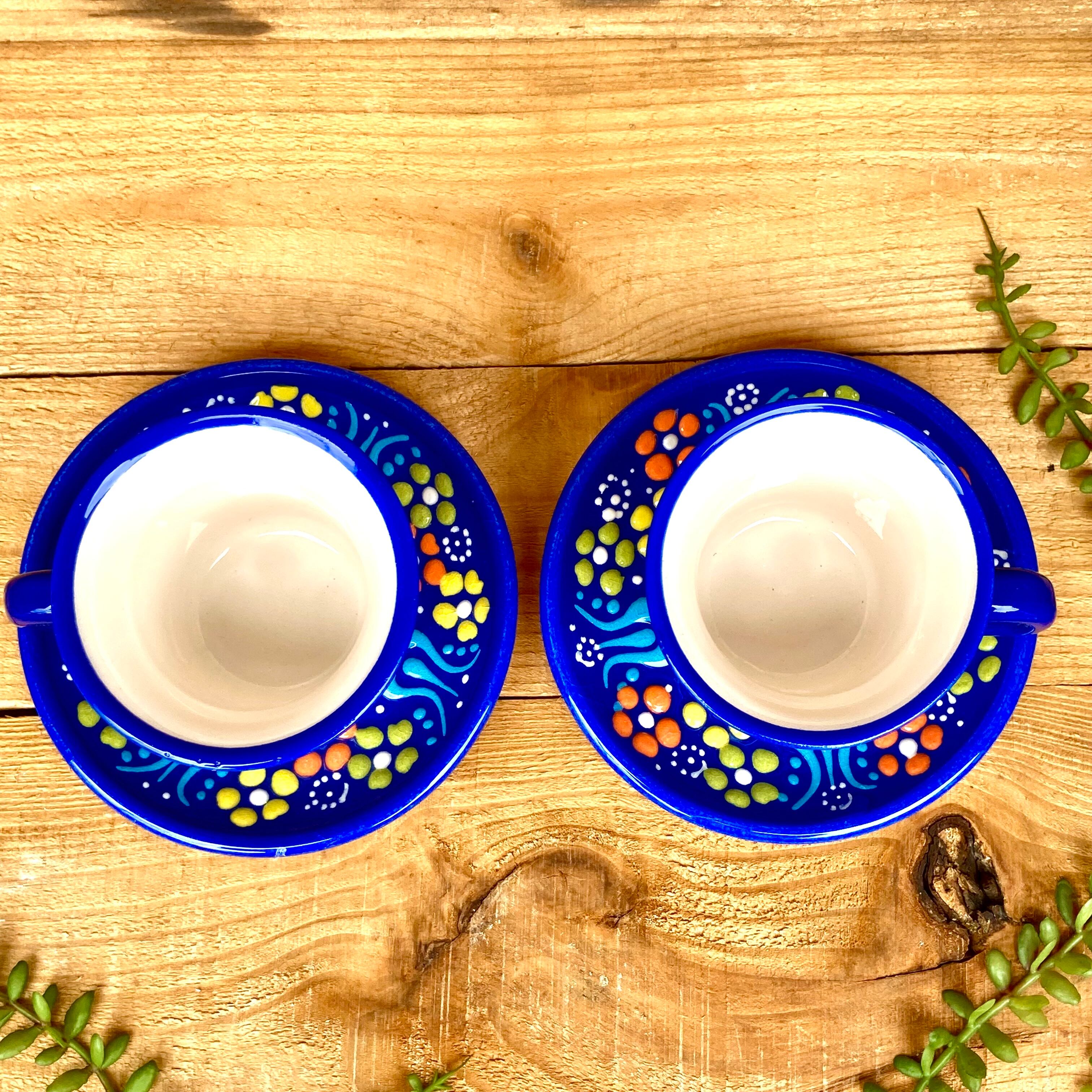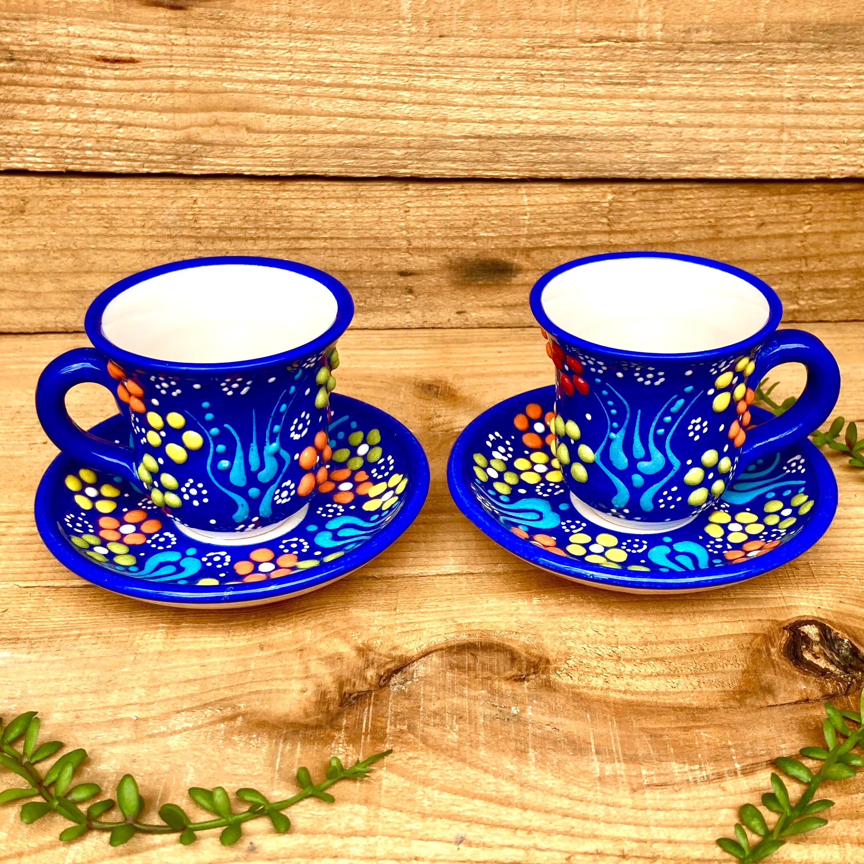 トルコの職人が1点1点絵付けしたカラフルなトルコセラミック陶器のカップ&ソーサー2脚セットです