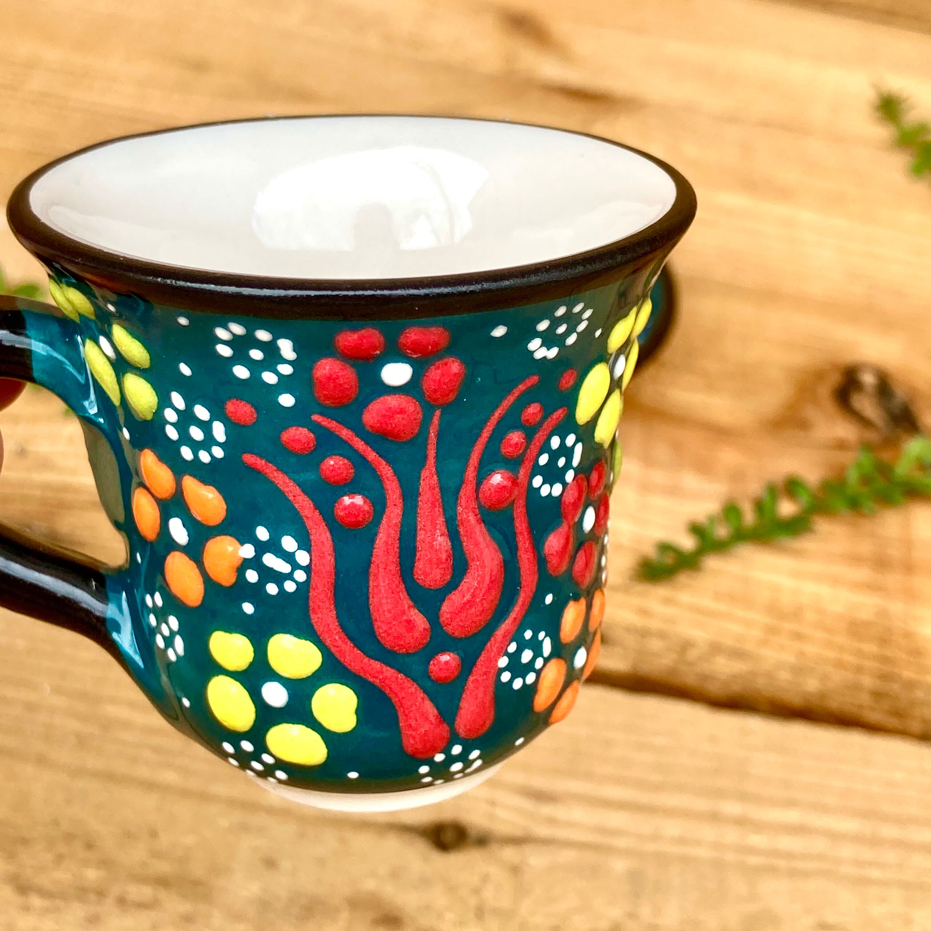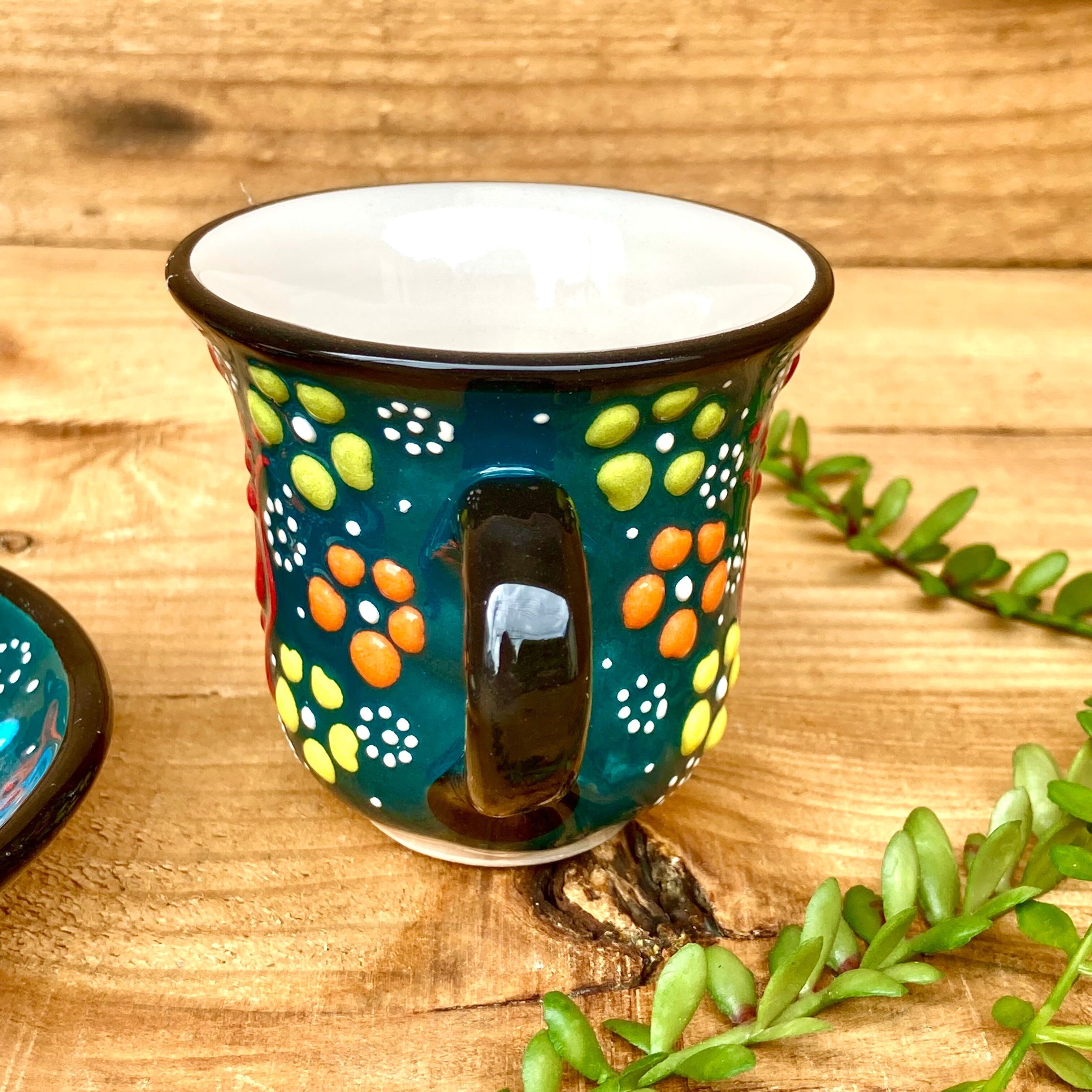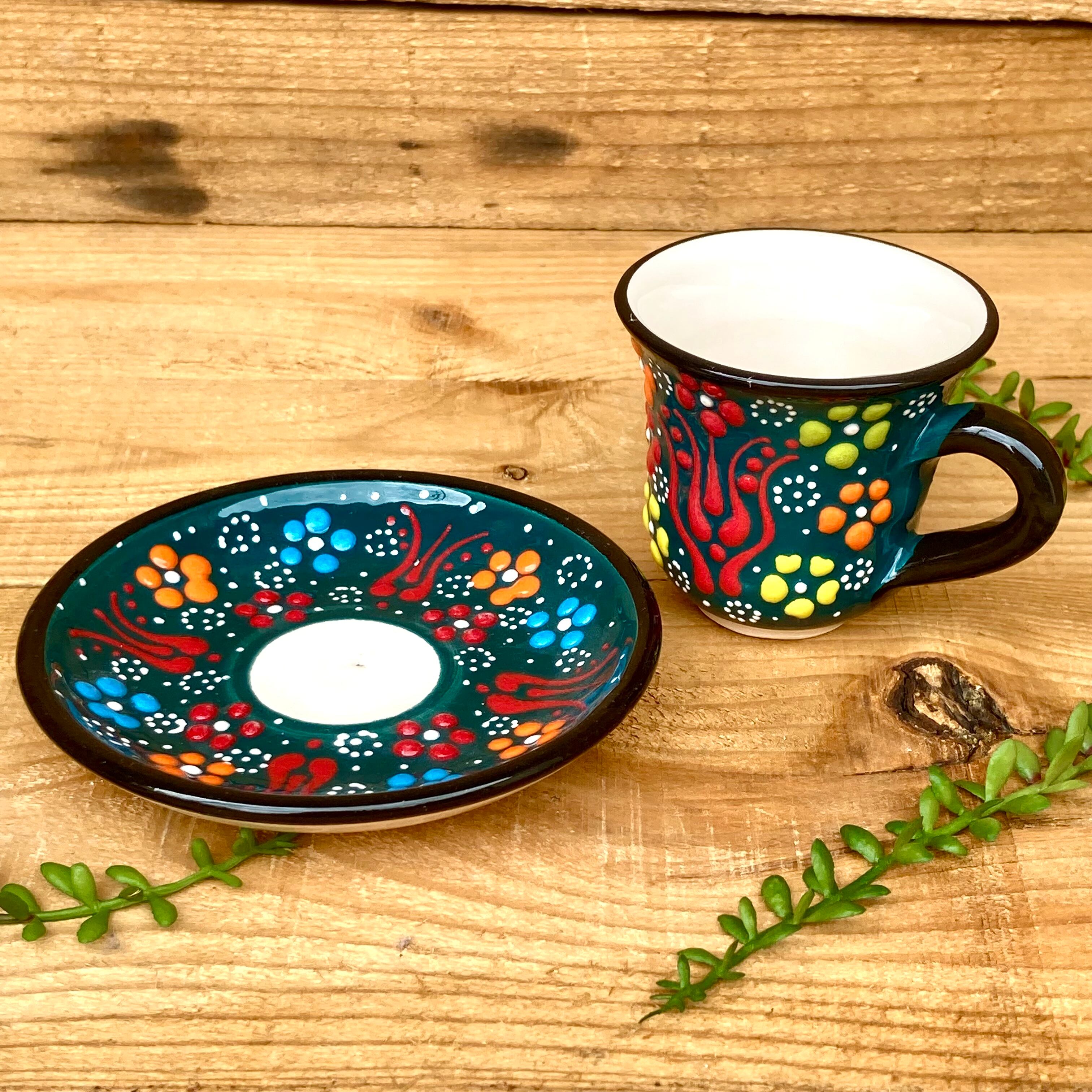 トルコの職人が1点1点絵付けしたカラフルなトルコセラミック陶器のカップ&ソーサーです