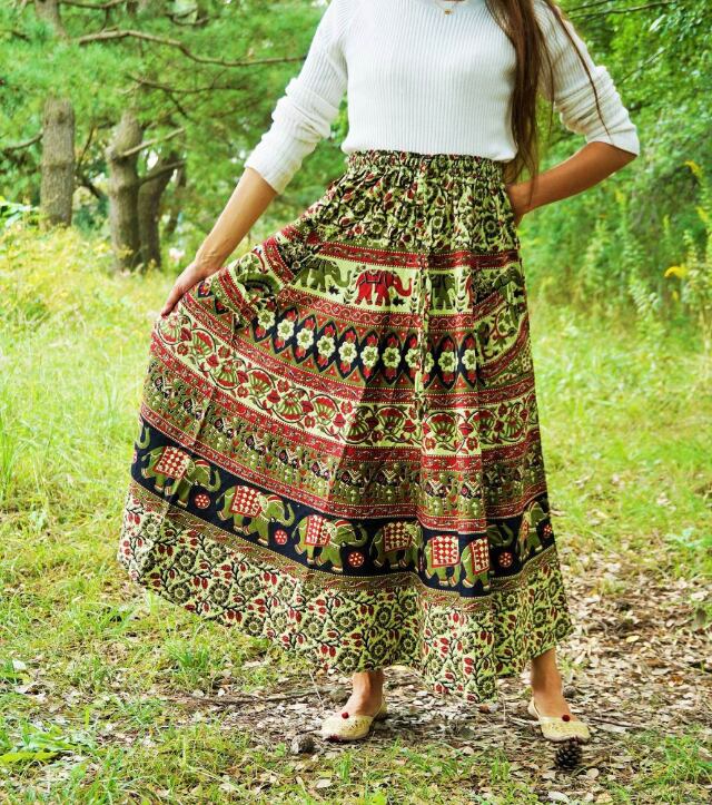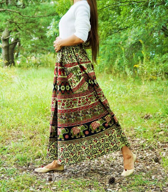 【ネパール】アジアン柄 ロングスカート フリーサイズ (グリーン) ポケット×2