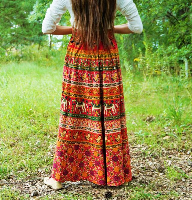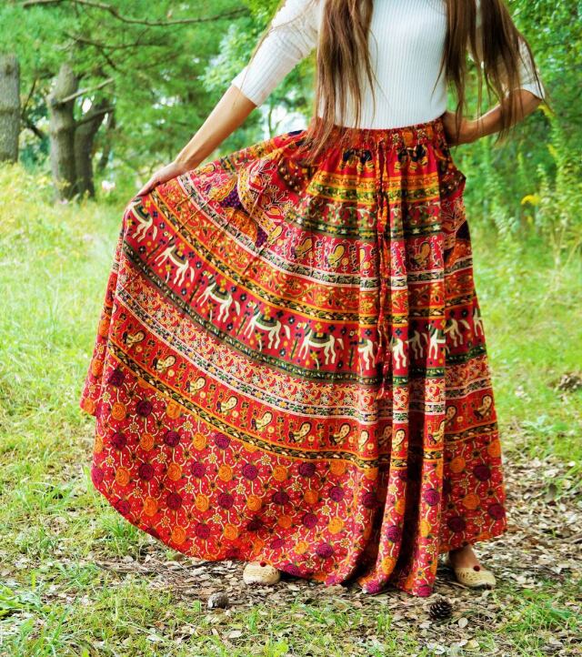 【ネパール】アジアン柄 ロングスカート フリーサイズ (レッド) ポケット×2