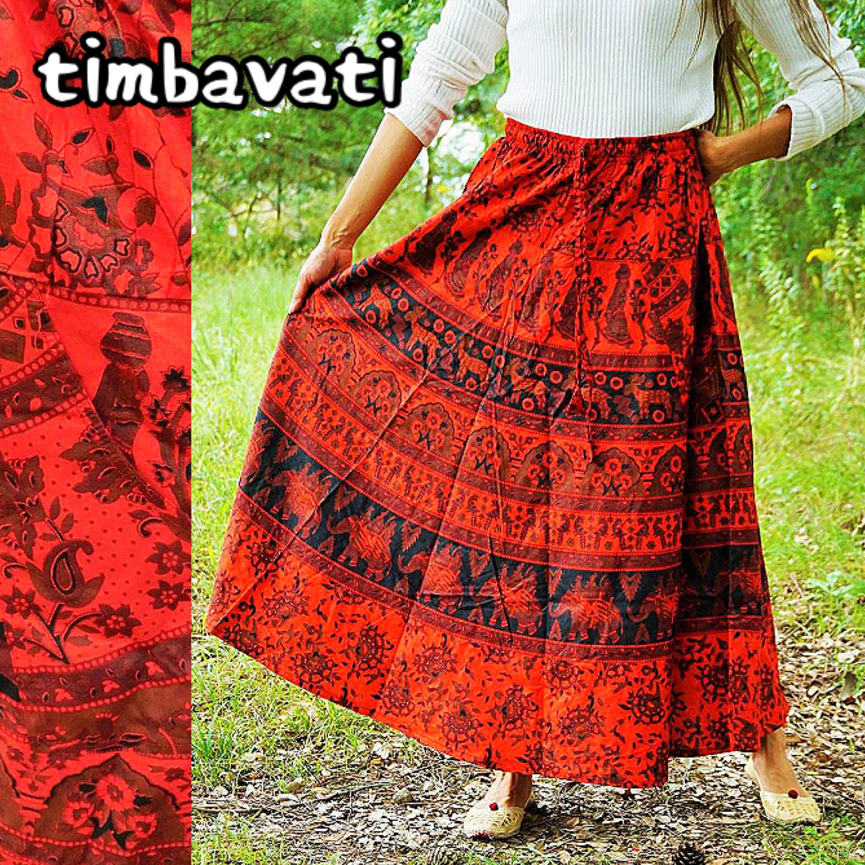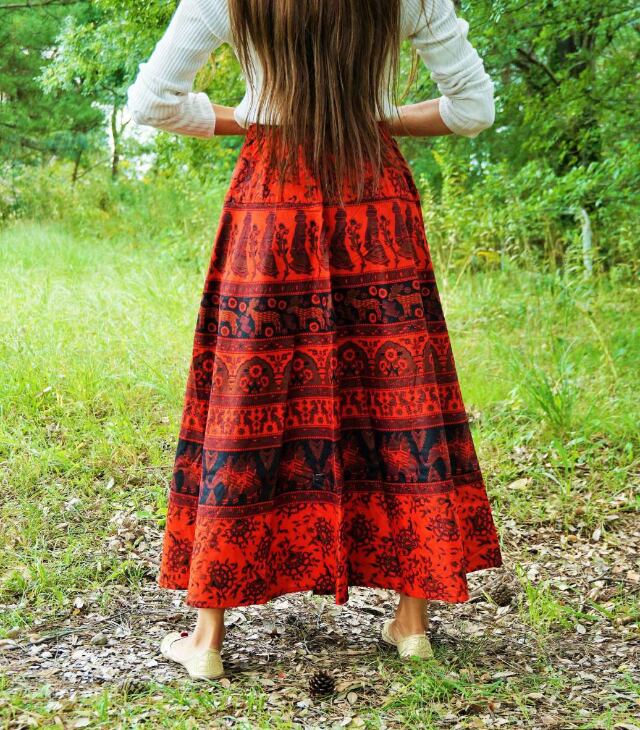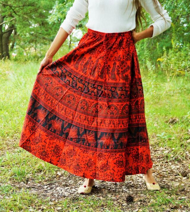 【ネパール】アジアン柄 ロングスカート フリーサイズ (レッド) ポケット×2