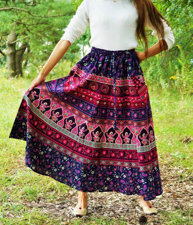【ネパール】アジアン柄 ロングスカート フリーサイズ (パープル) ポケット×2