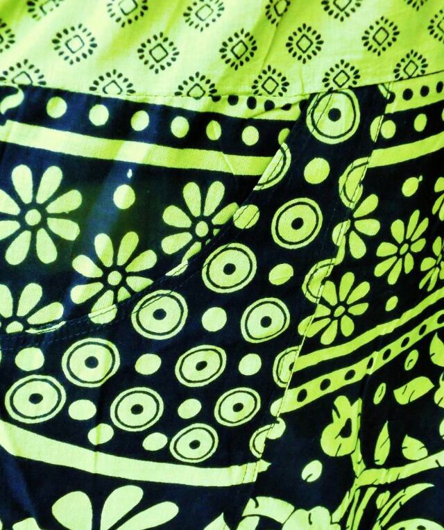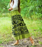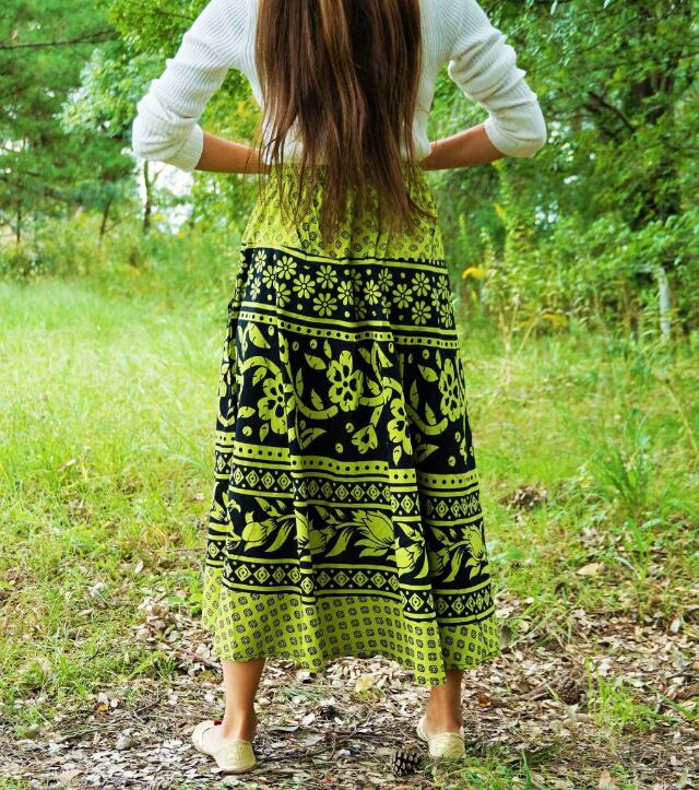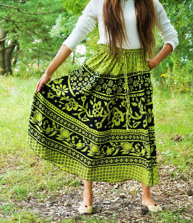 【ネパール】アジアン柄 ロングスカート フリーサイズ (グリーン) ポケット×2