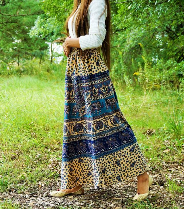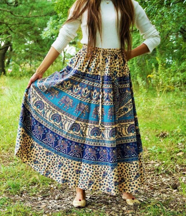 【ネパール】アジアン柄 ロングスカート フリーサイズ (ブルー) ポケット×2