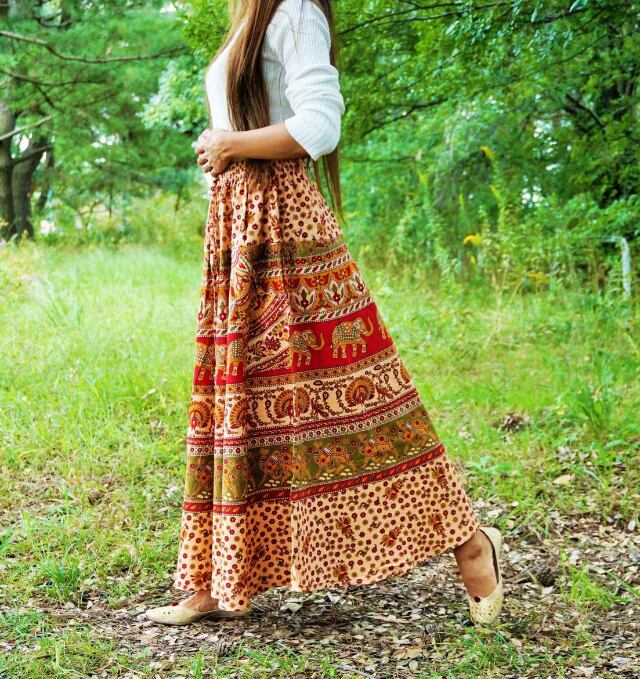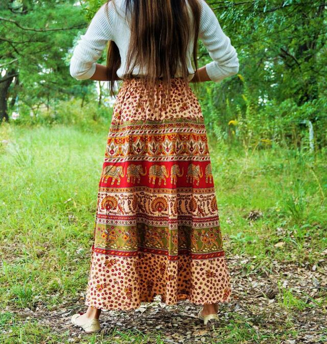 【ネパール】アジアン柄 ロングスカート フリーサイズ (ピンクベージュ) ポケット×2