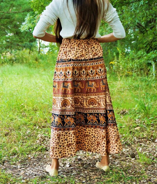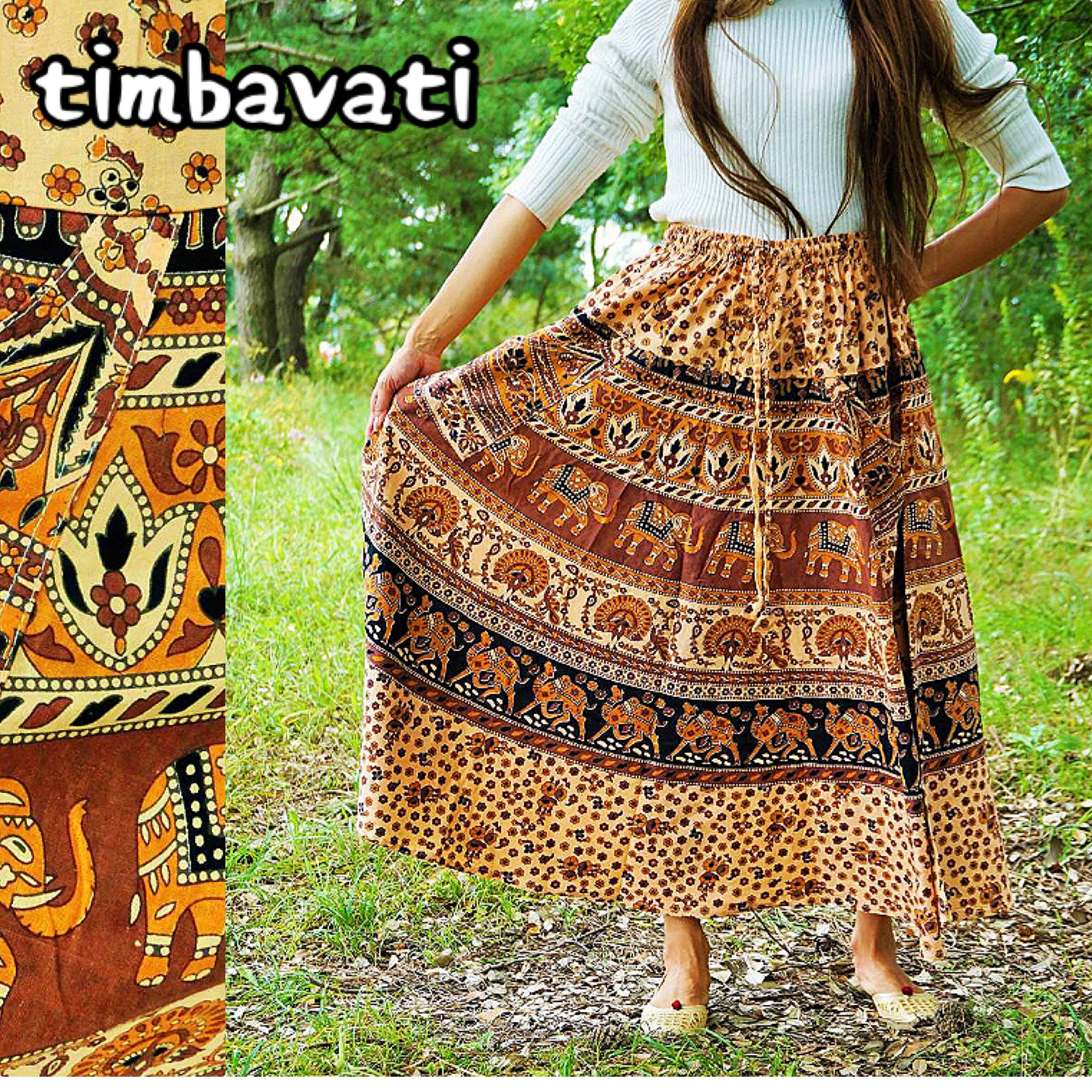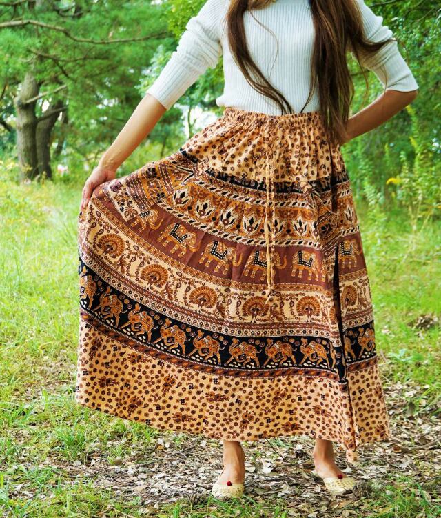 【ネパール】アジアン柄 ロングスカート フリーサイズ (ブラウン) ポケット×2