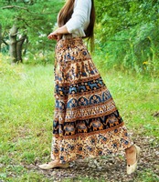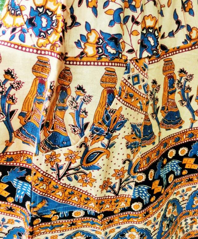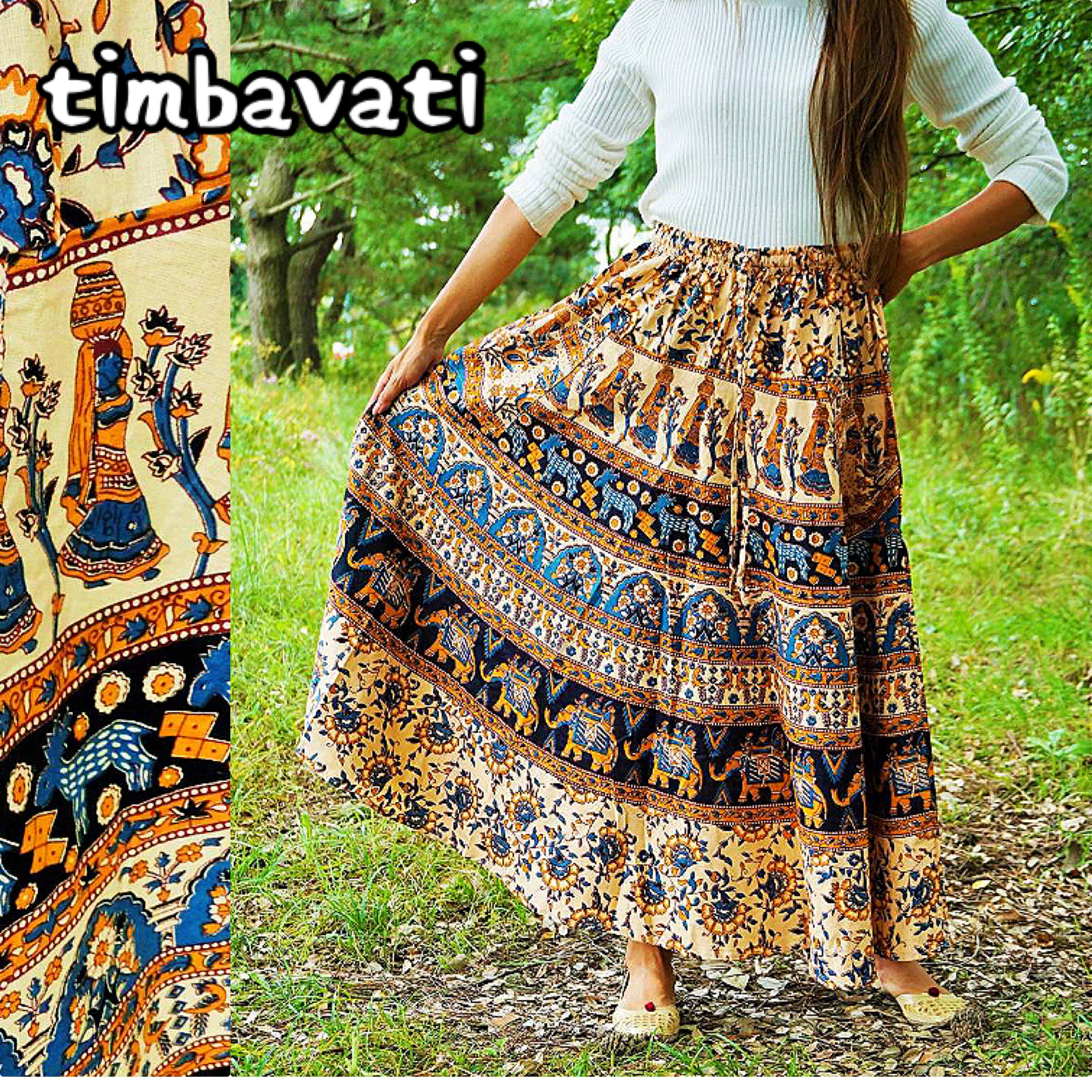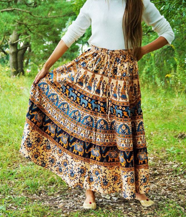 【ネパール】アジアン柄 ロングスカート フリーサイズ (ベージュ) ポケット×2