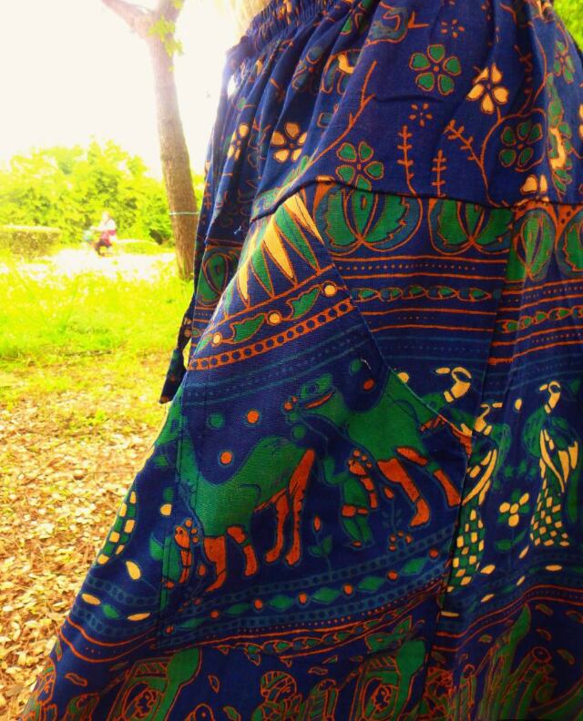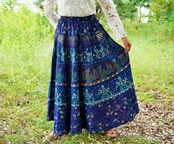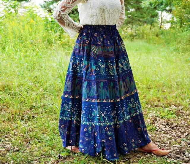 【ネパール】アジアン柄 ロングスカート フリーサイズ (ブルー) ポケット×2