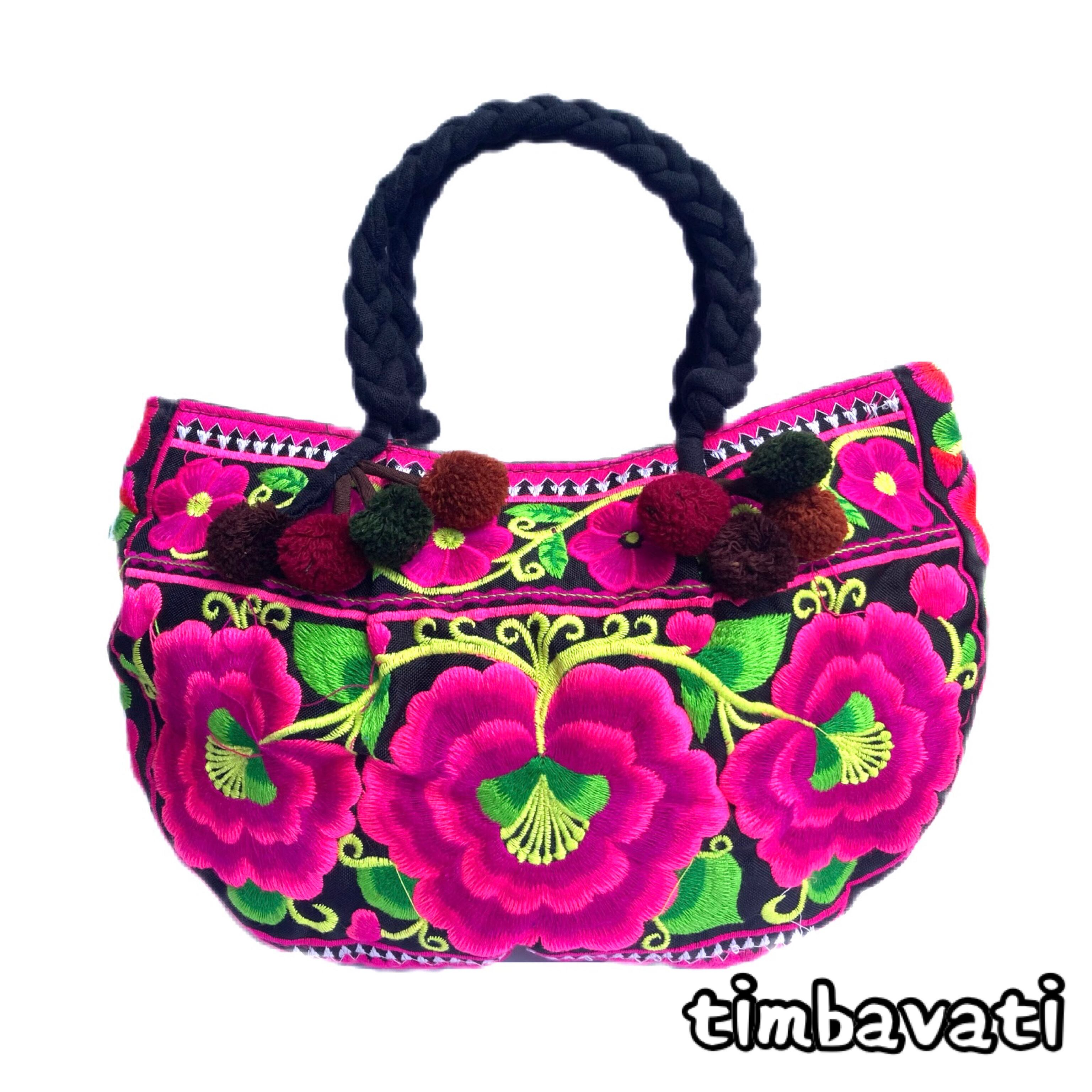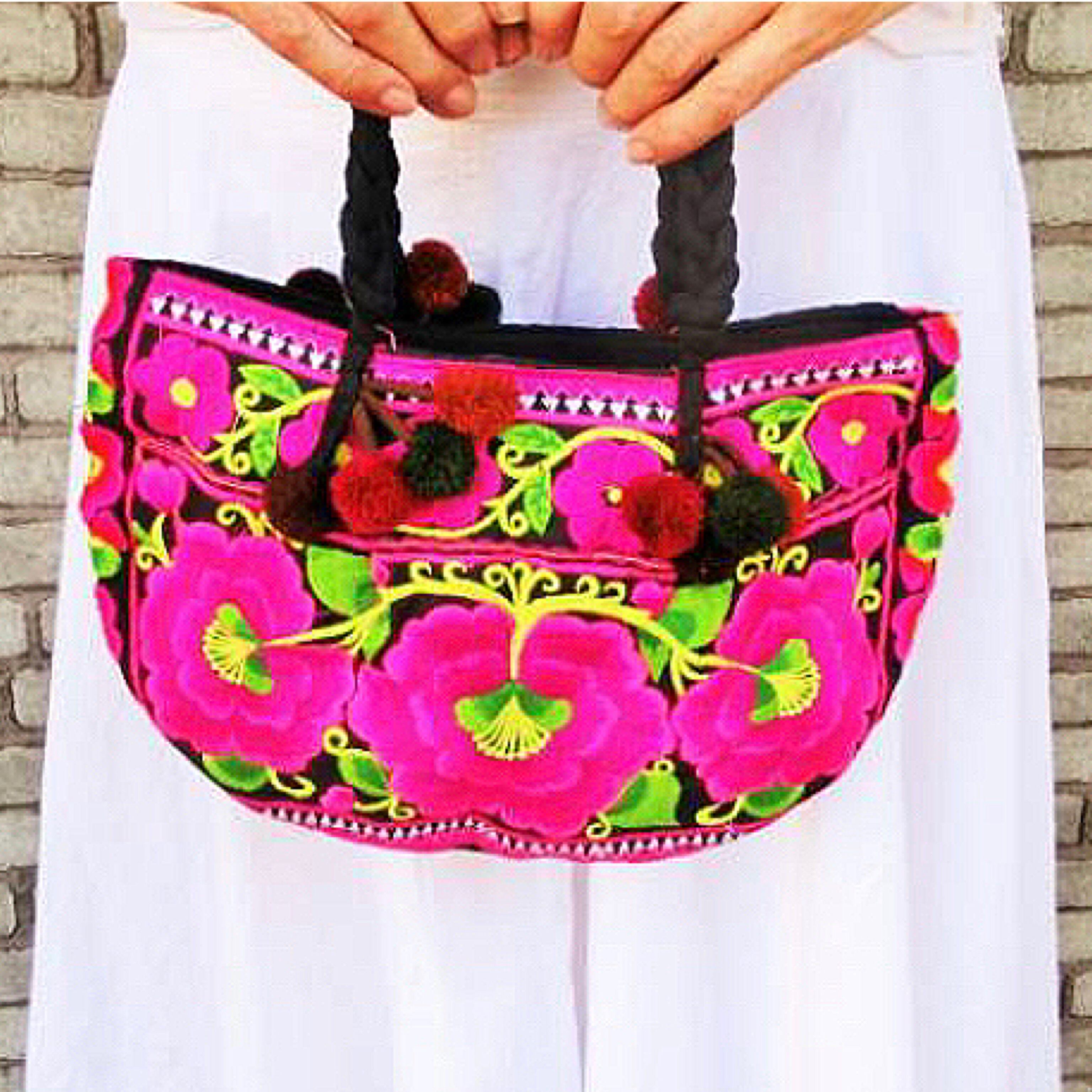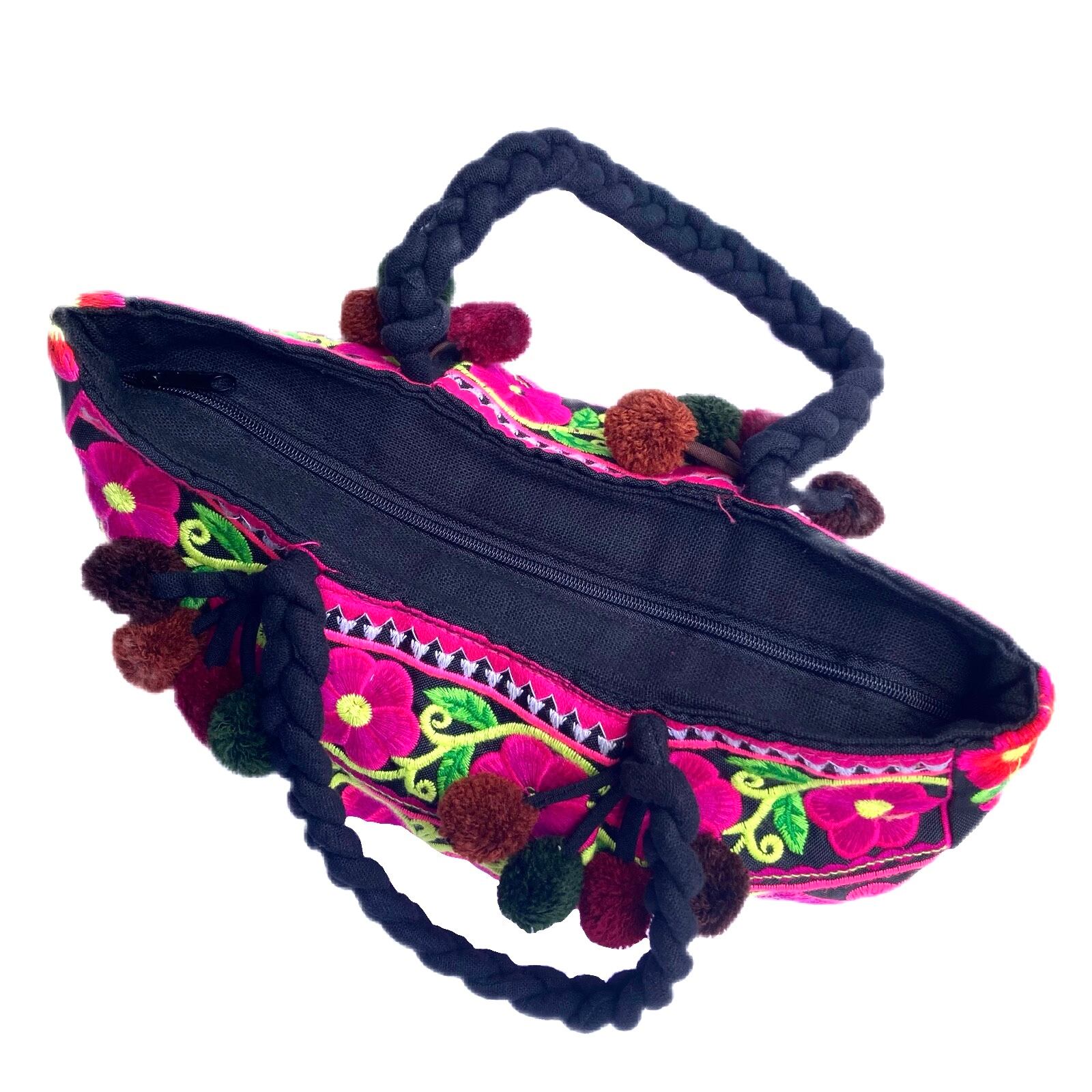 【タイ】モン族 刺繍 ポンポン ハンドバッグ