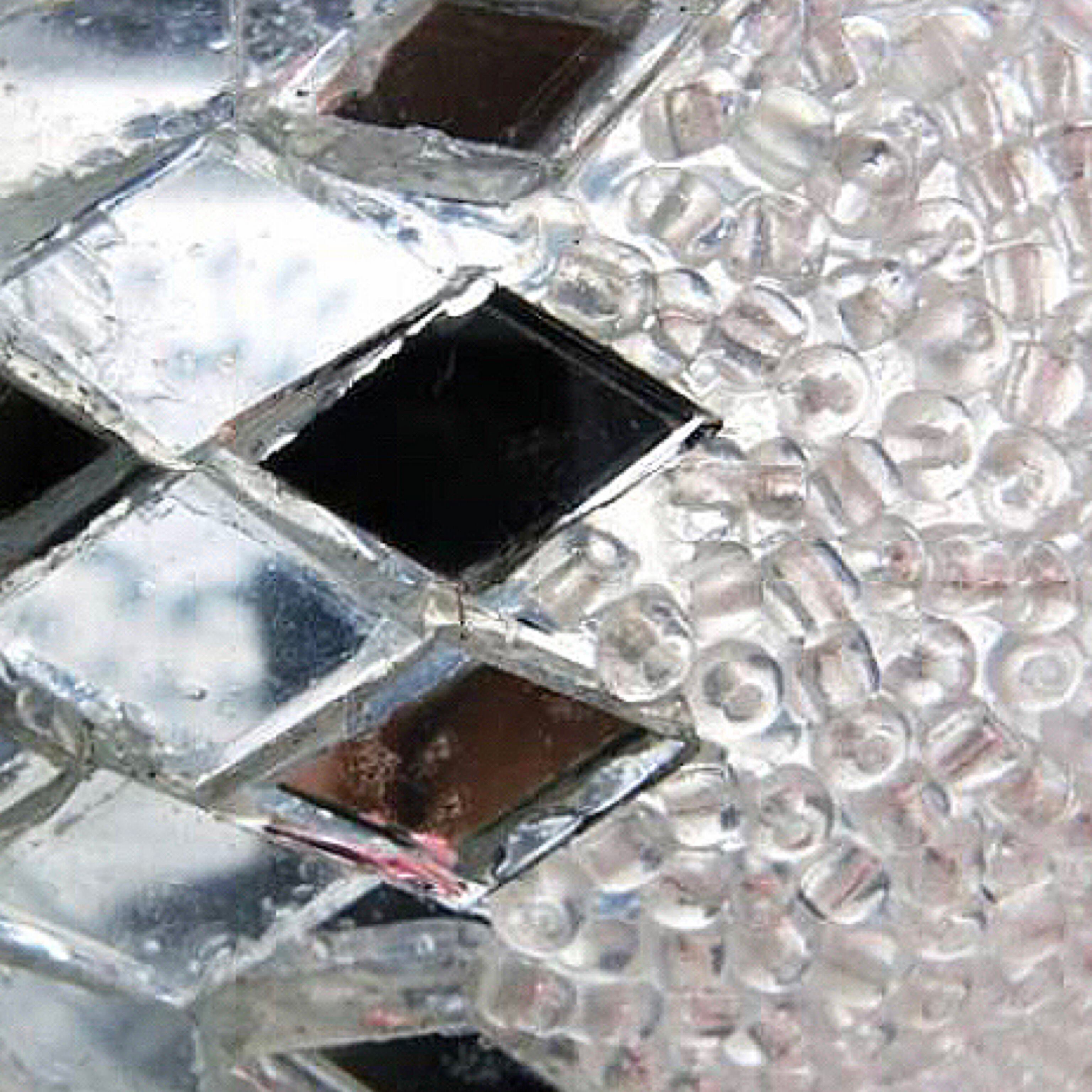 球状のガラスの表面に、カットガラスやビーズをモザイク上に貼り付けた手の込んだランプシェードです。