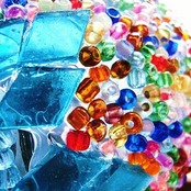 球状のガラスの表面に、カットガラスやビーズをモザイク上に貼り付けた手の込んだランプシェードです。