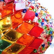 球状のガラスの表面に、カットガラスやビーズをモザイク上に貼り付けた手の込んだランプシェードです。