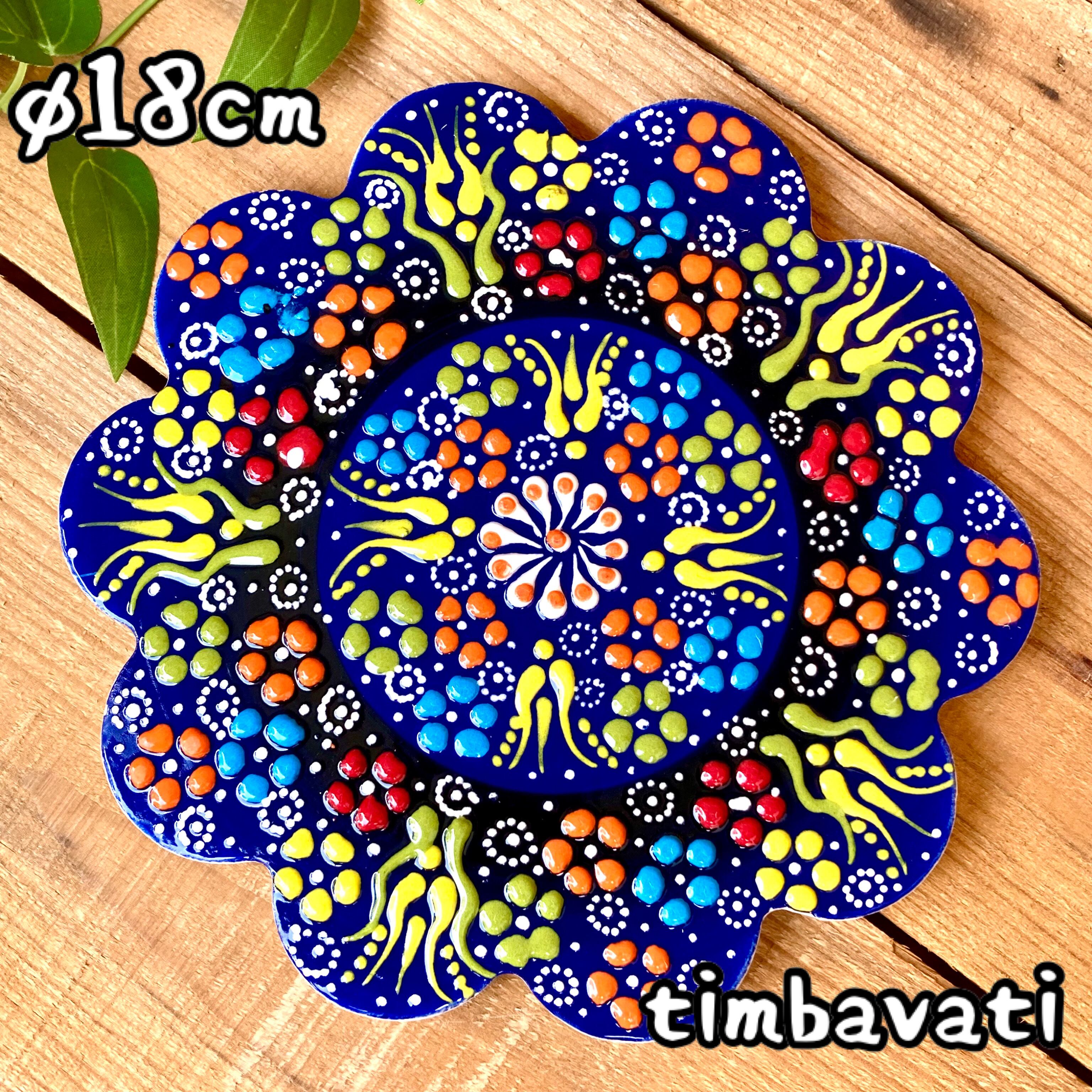 18cm【トルコ陶器】手描き 鍋敷き 壁掛け タイル * ネイビー ダークブルー * キュタフヤ陶器