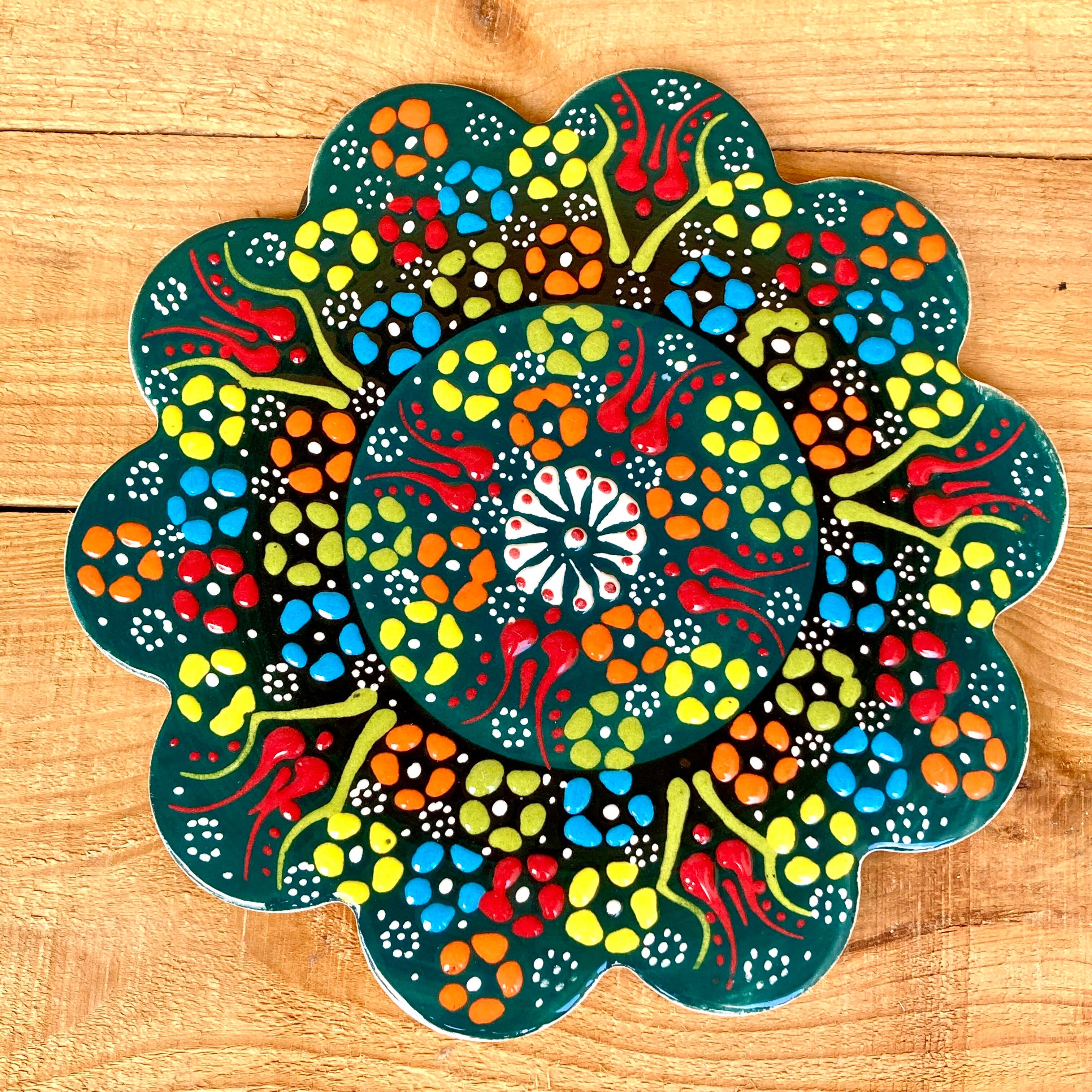 18cm【トルコ陶器】手描き 鍋敷き 壁掛け タイル * ダークグリーン * キュタフヤ陶器