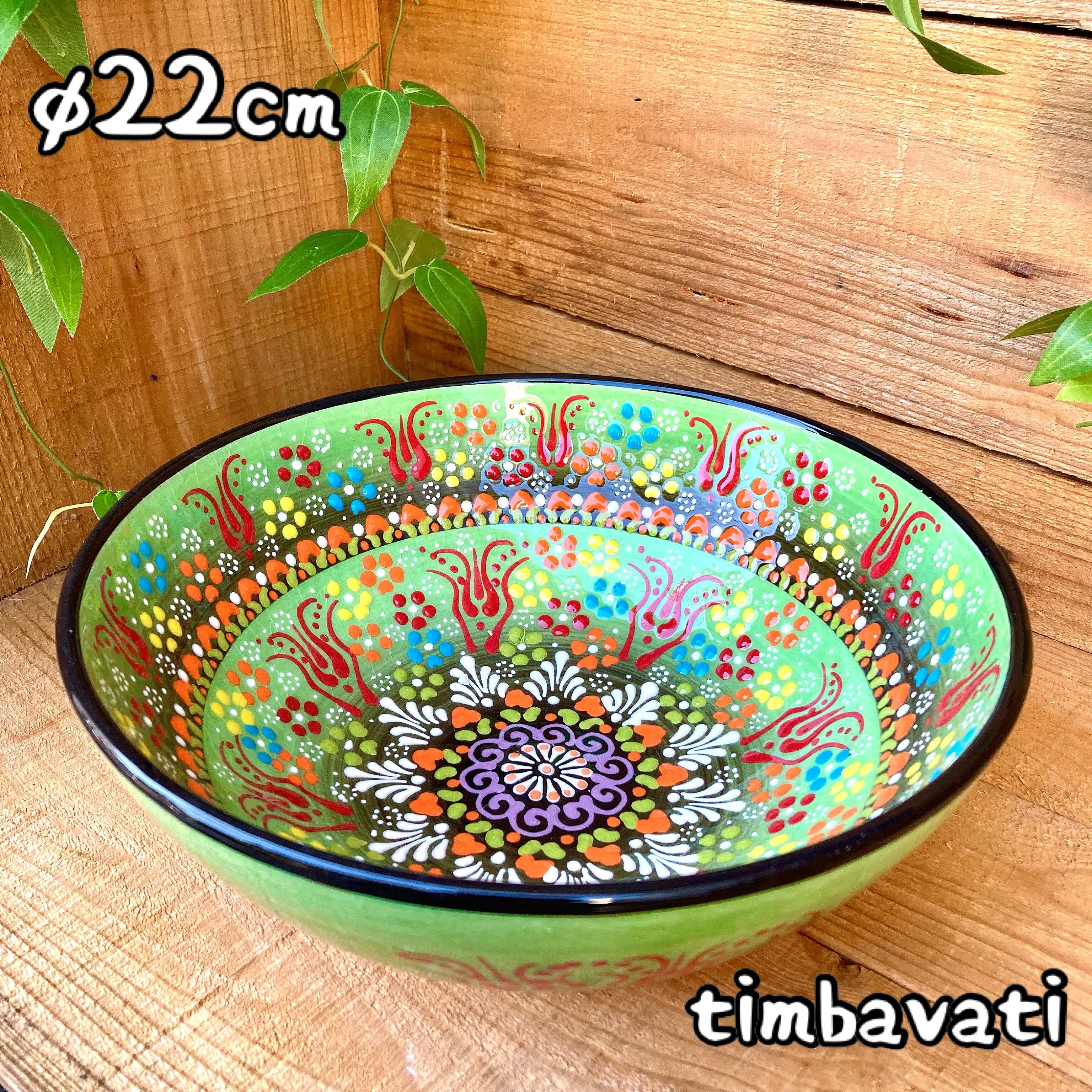 22cm【トルコ陶器】手描き ボウル 皿 *ライトグリーン*キュタフヤ陶器